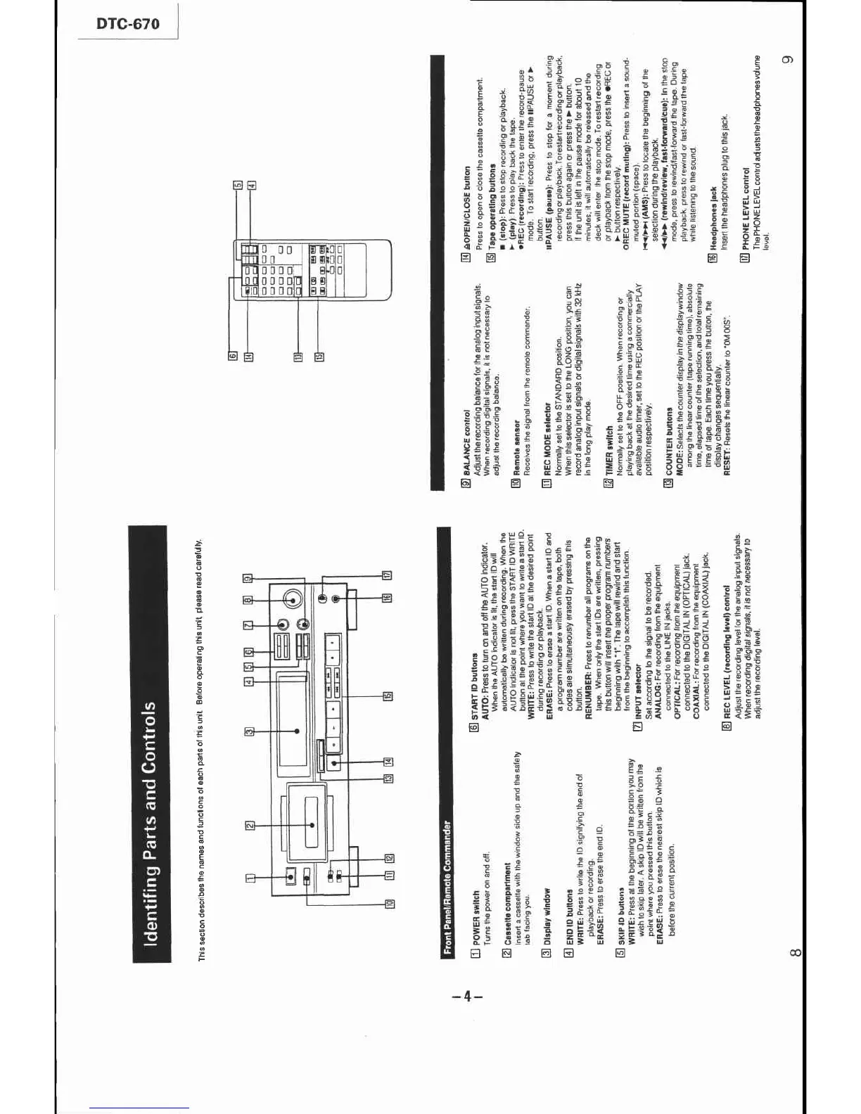 Sony DTC-670 - Identifing Parts and Controls; Front Panel and Remote Controls