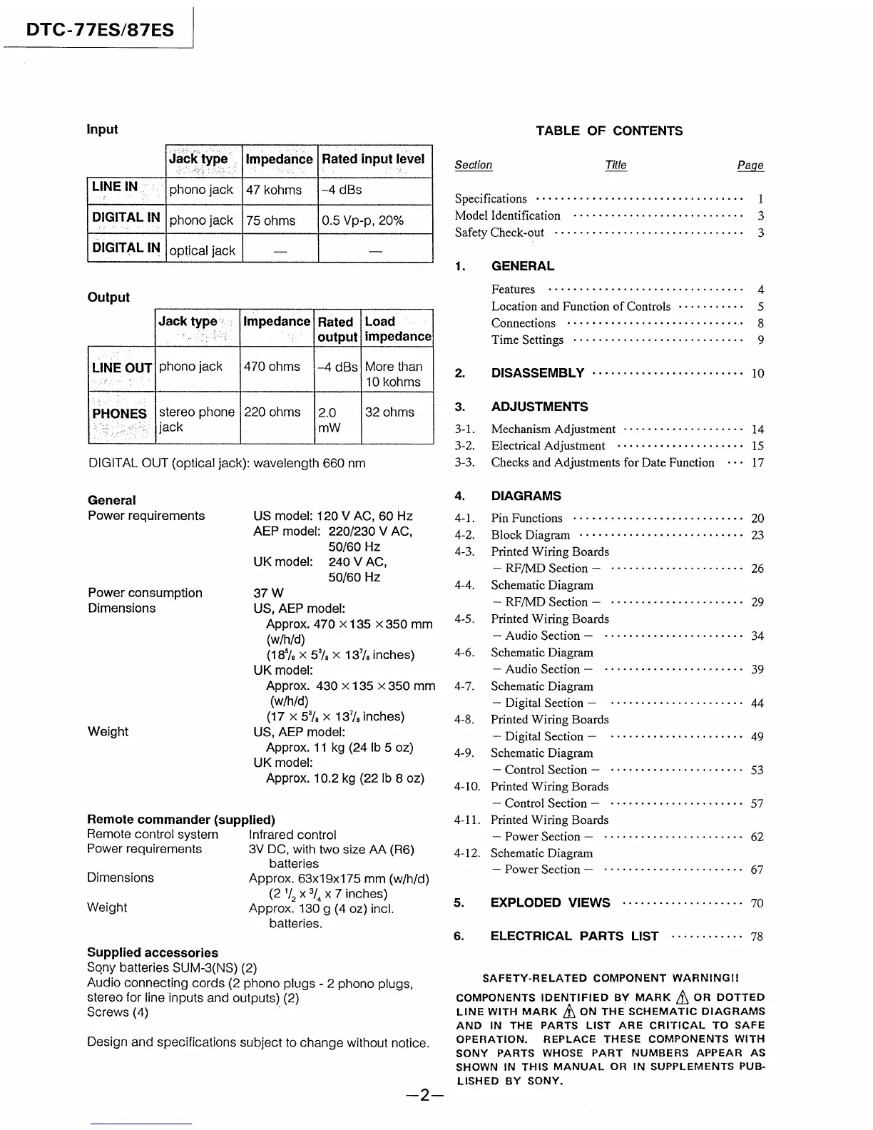Sony DTC-77ES - Table of Contents; Safety-Related Component Warning