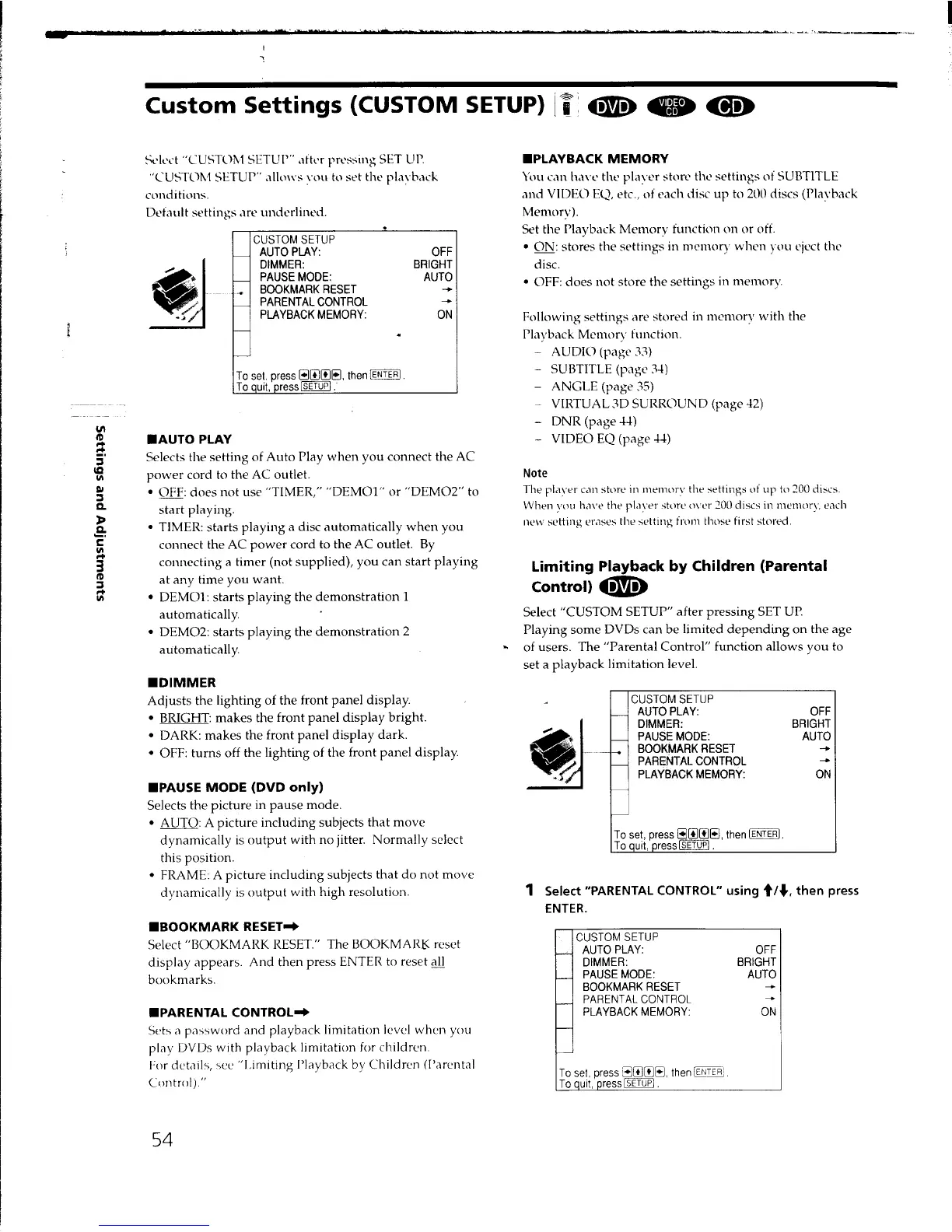 Sony DVP-C650D - Custom Settings Menu Functions; Playback Memory and Parental Control Setup