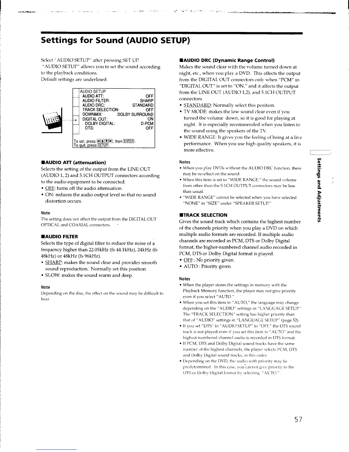 Sony DVP-C650D - Audio Setup and Sound Enhancement Options; Audio Attenuation, Filter, and DRC Settings