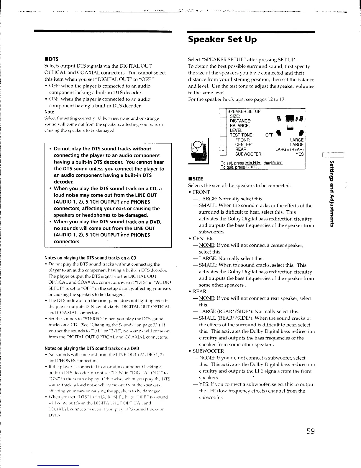 Sony DVP-C650D - Speaker Configuration and Initial Setup; Speaker Size and Type Settings (Front, Center, Rear); Basic Speaker Calibration Settings