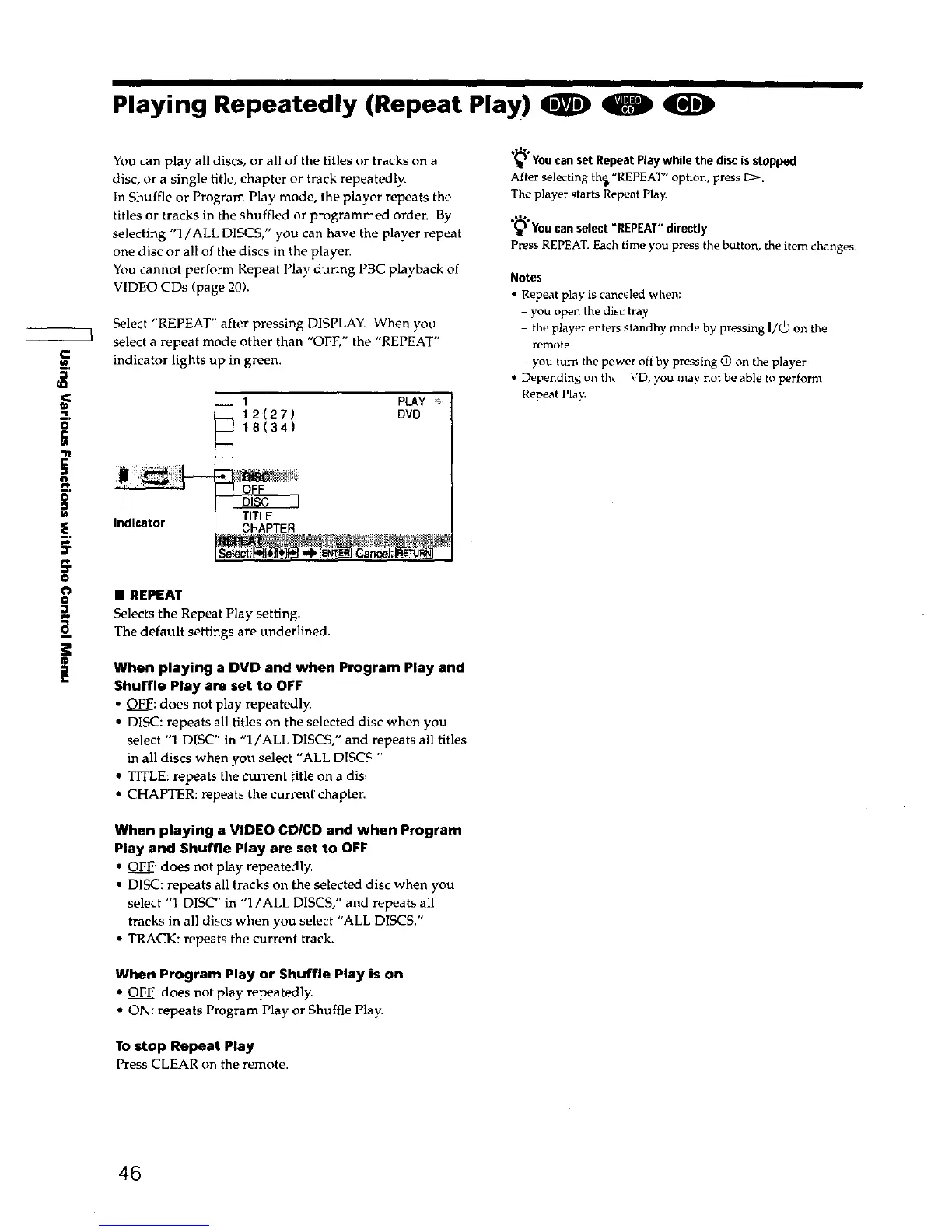 select "1 DISC" in "l/ALL DISCS," and repeats all titles