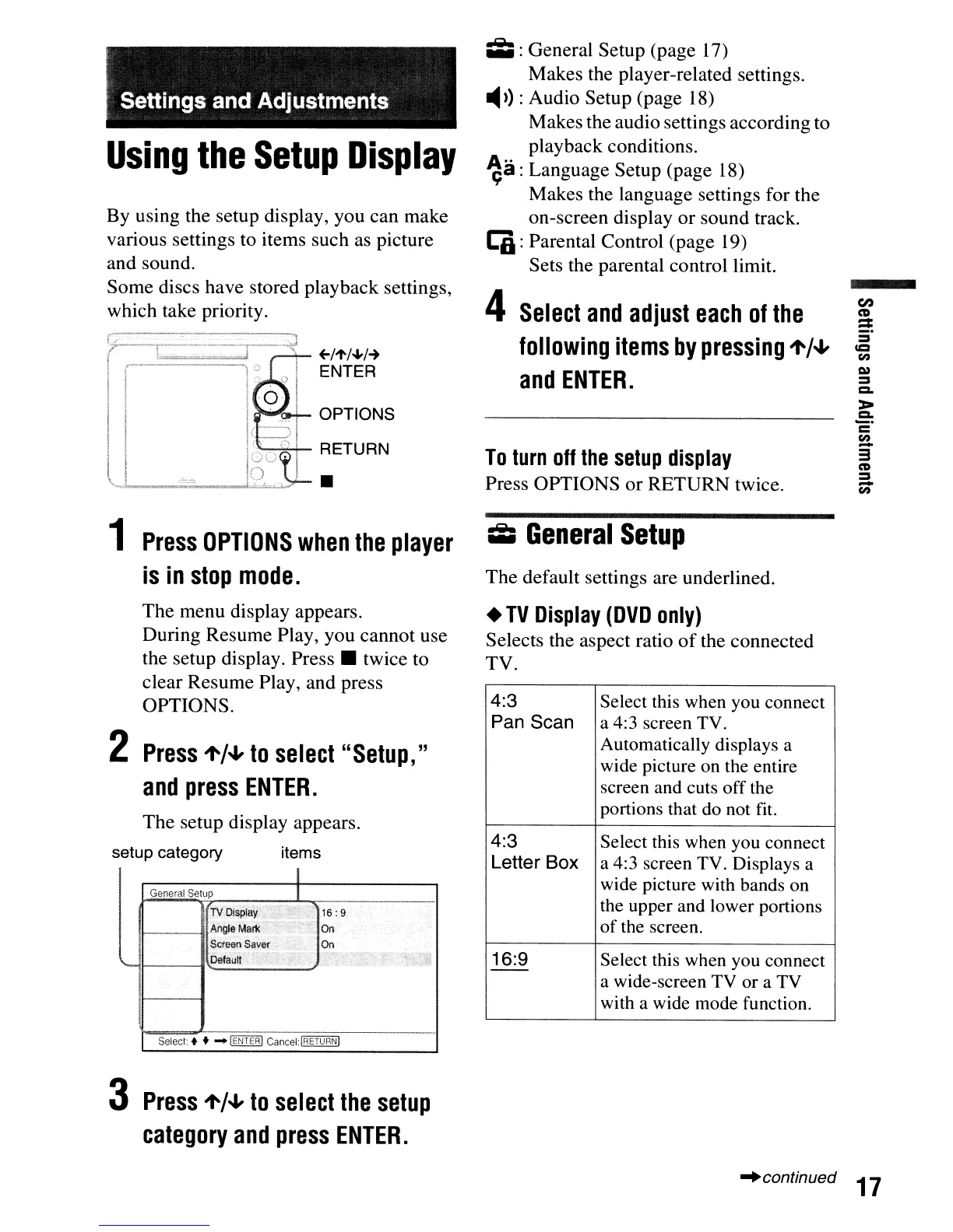 By using the setup display, you