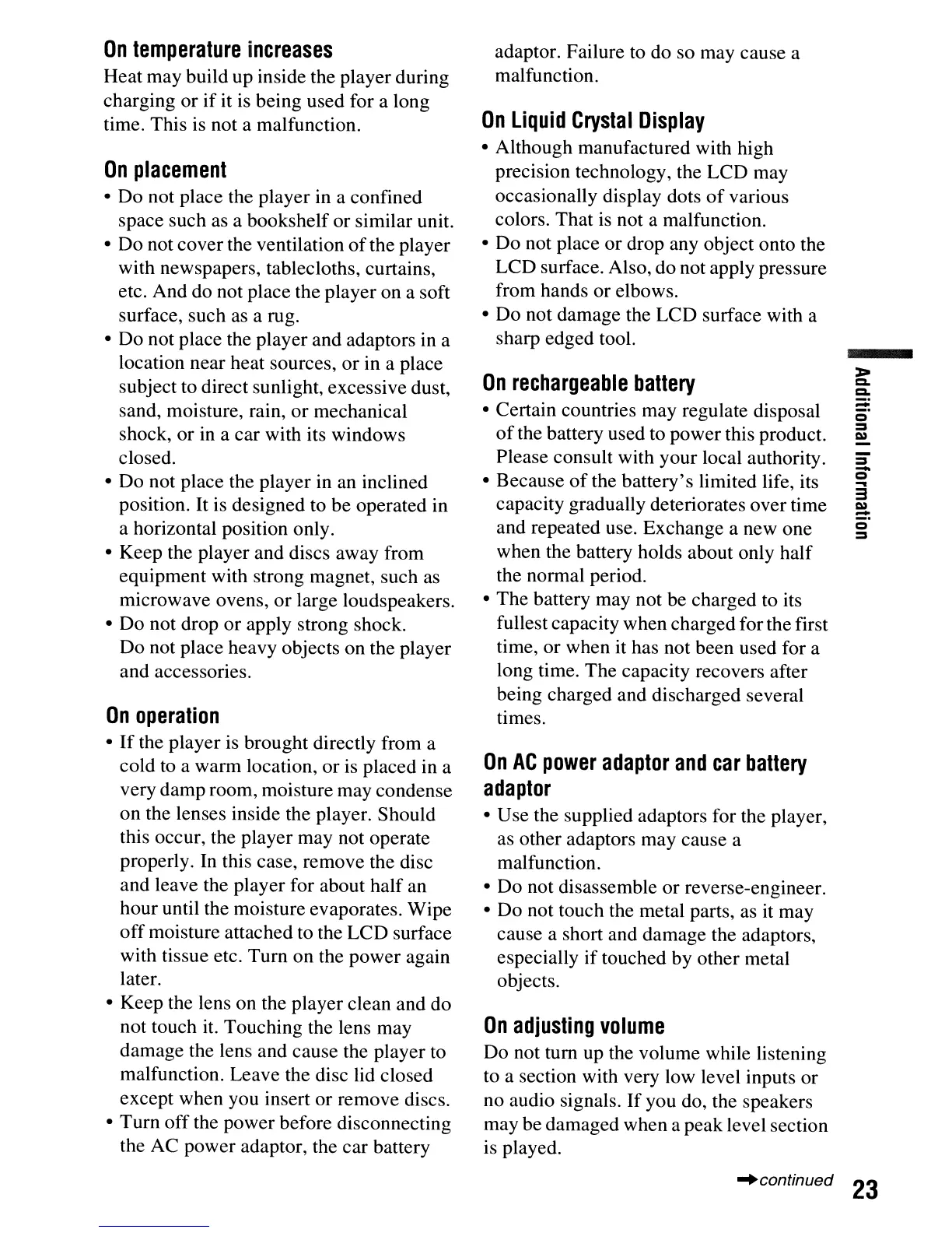• Do not place the player and adaptors in a