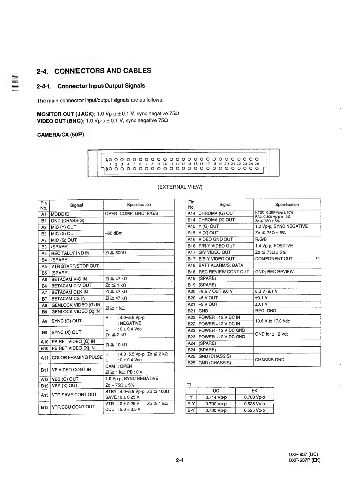 Sony DXC-637 - Service Information: Connectors and Cables; Input;Output Signal Connectors