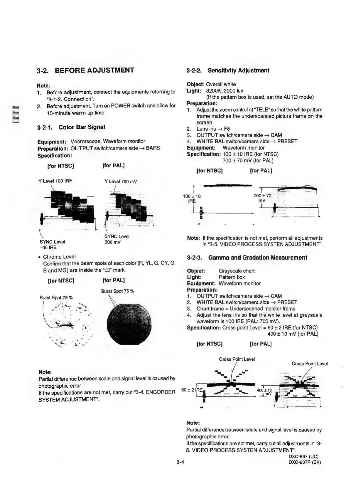 Sony DXC-637 - Alignment: Before Adjustment Procedures; Color Bar Signal Adjustment; Sensitivity Adjustment; Gamma and Gradation Measurement