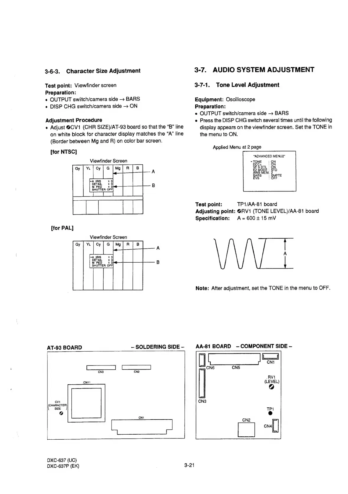 Sony DXC-637 - Character Size Adjustment; Alignment: Audio System Adjustments; Tone Level Adjustment