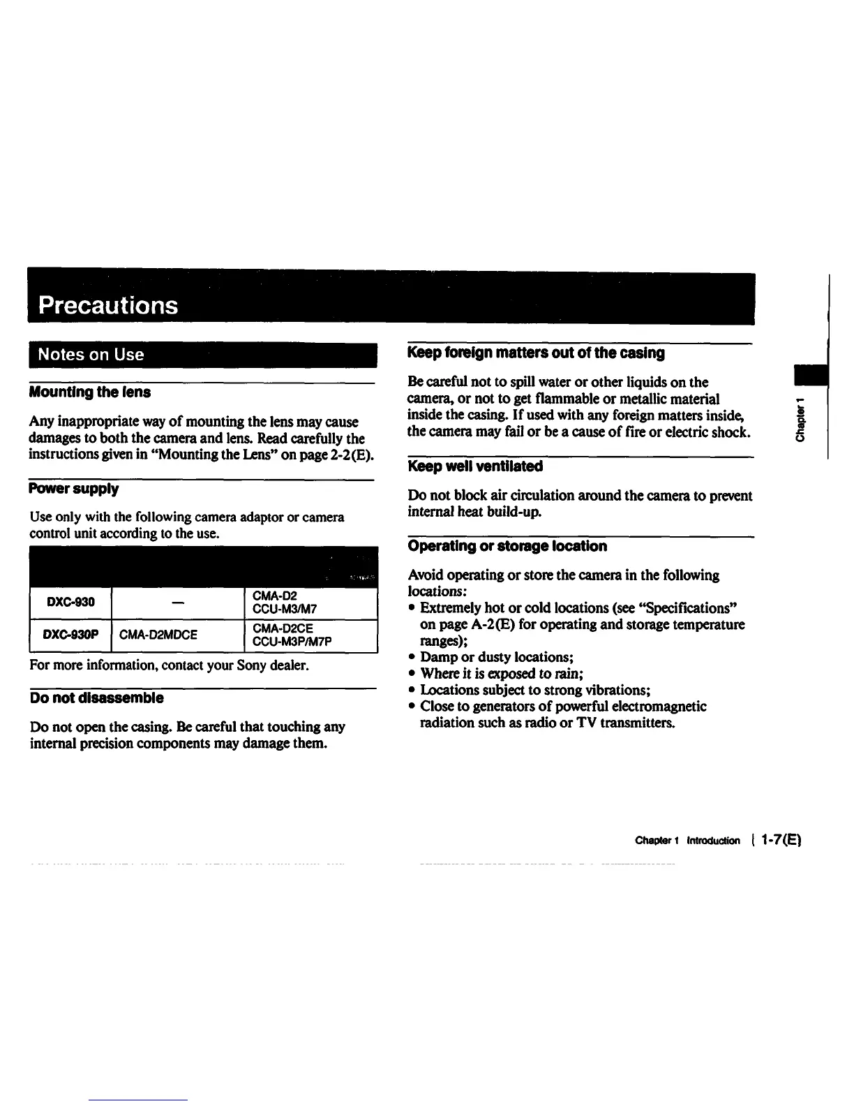 Sony DXC-930 - Precautions; Power Supply; Operating or Storage Location