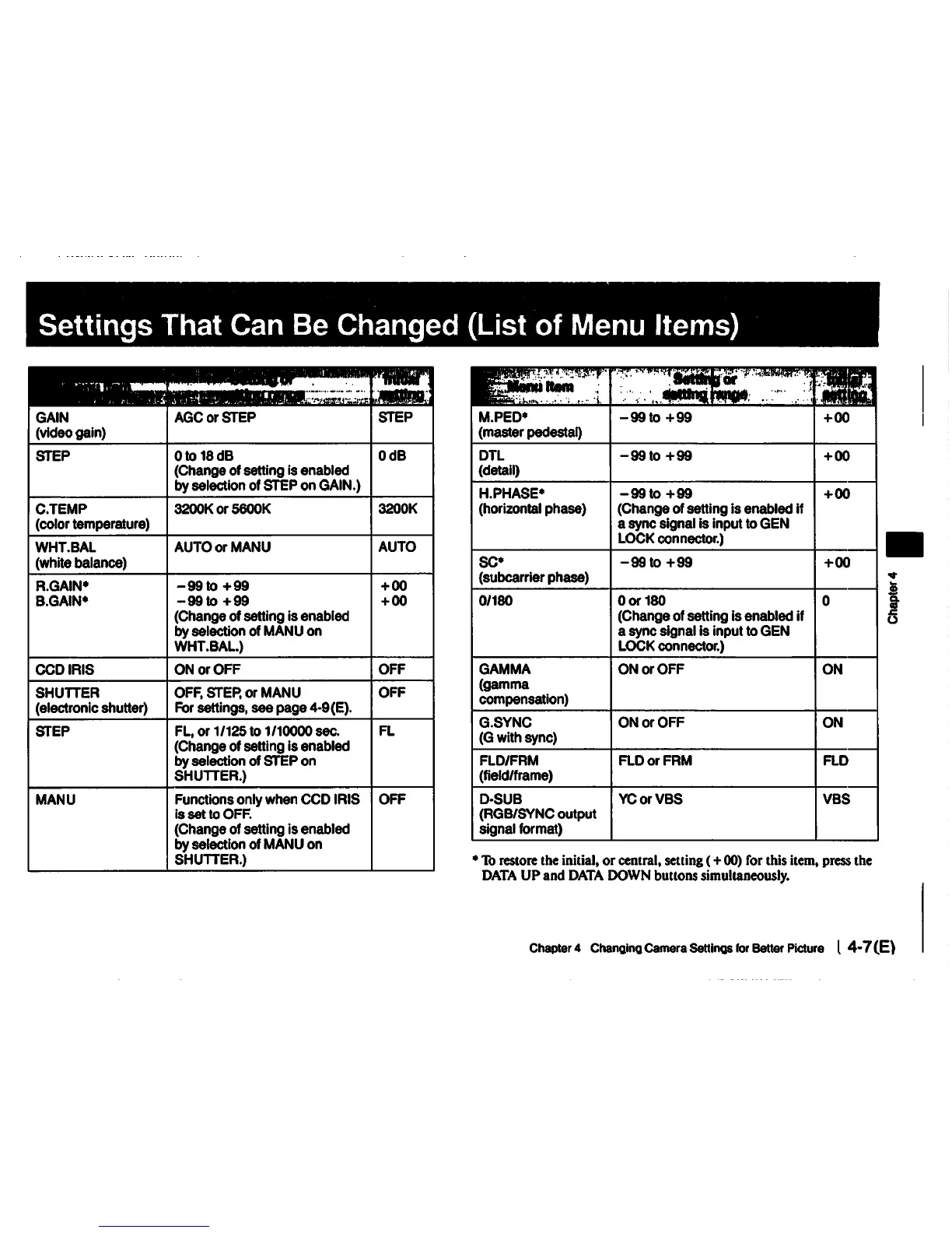 Sony DXC-930 - Settings that Can be Changed - List of Menu Items