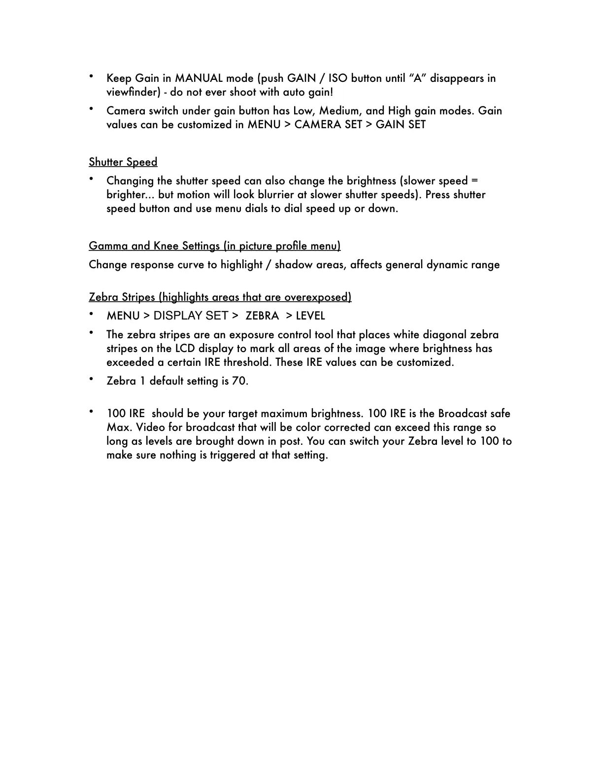 Start with your zebra set to 100 IRE to make sure skin tone is well exposed – none
