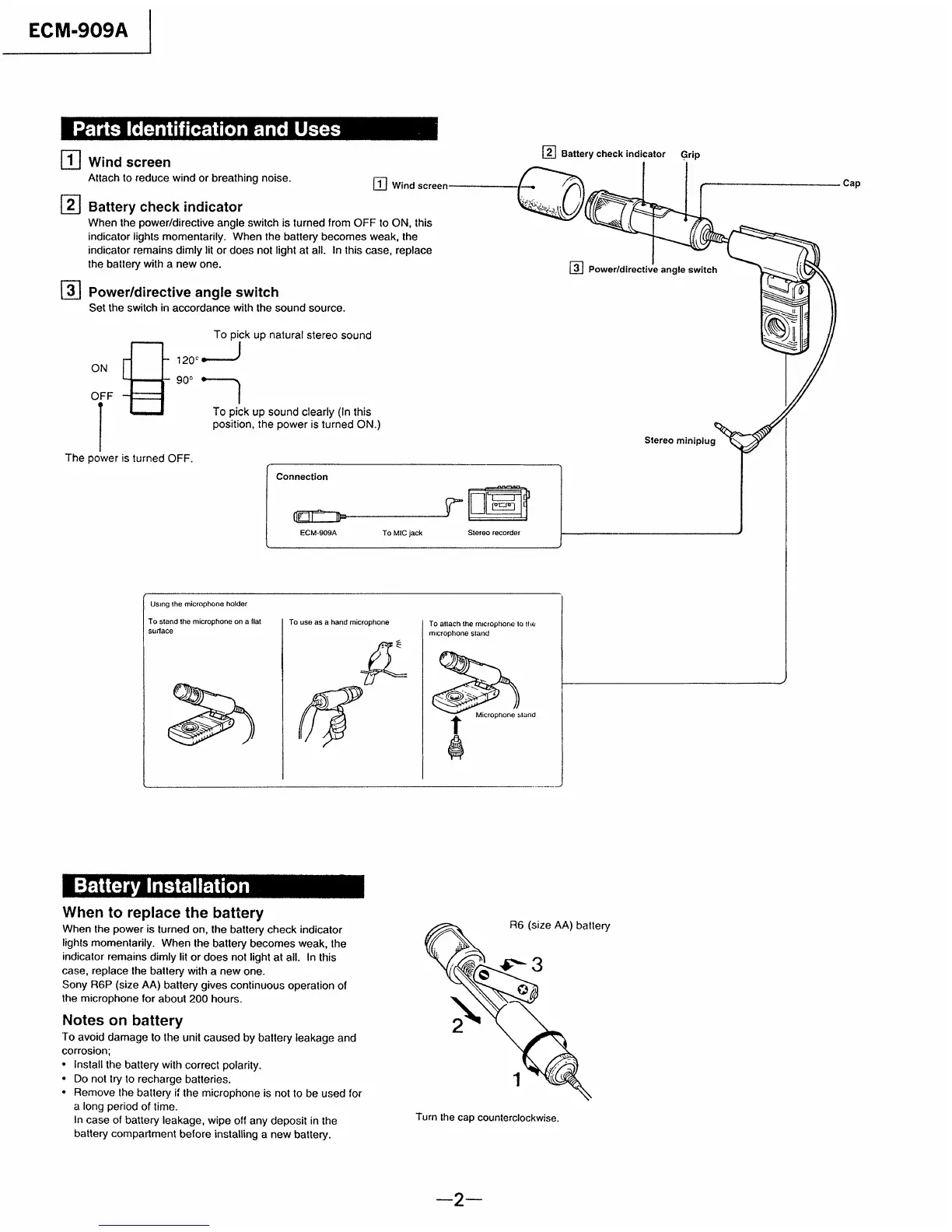 Sony ECM-909A - Parts Identification and Uses; Component Identification and Usage; Battery Installation and Notes; Battery Replacement and Handling