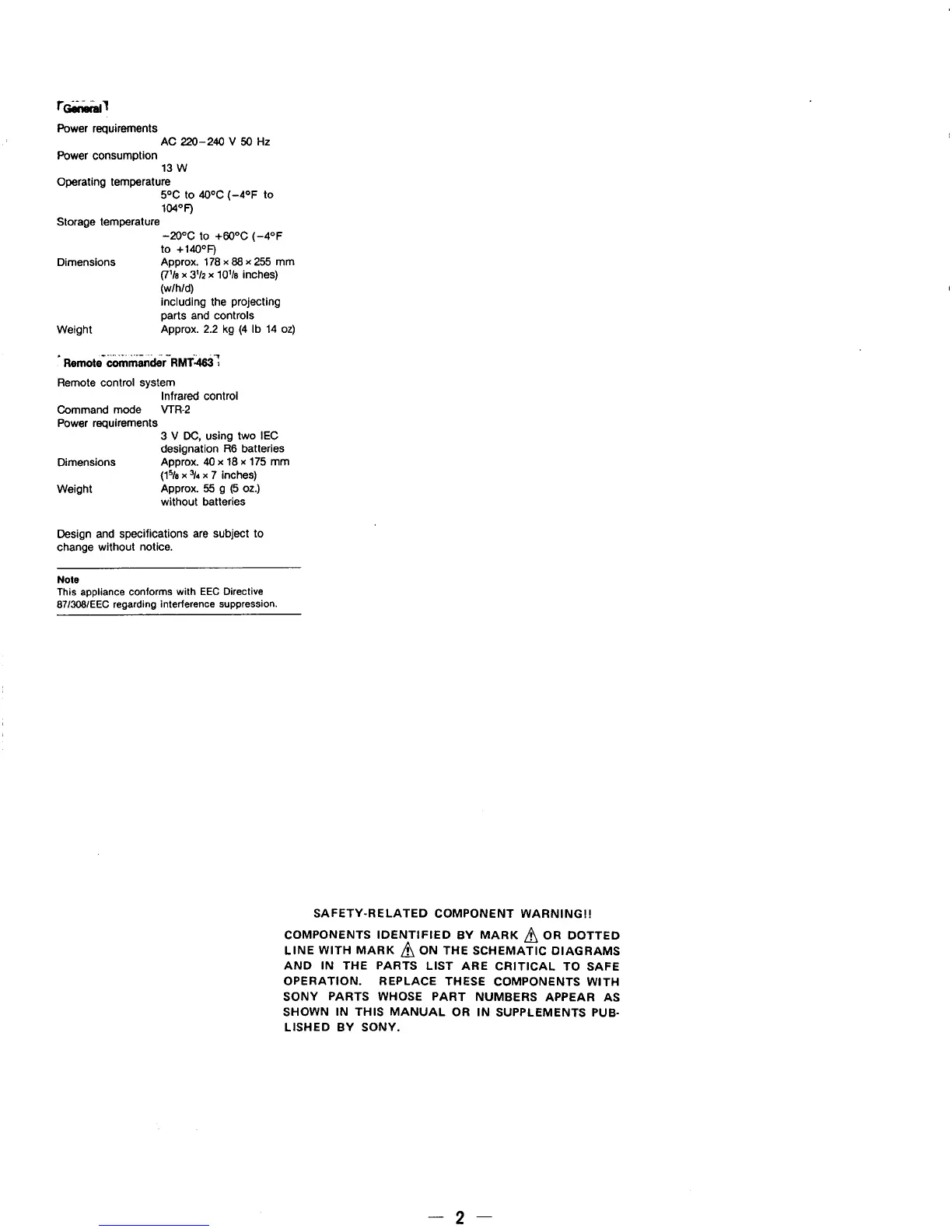 Sony EV-C3E - General Information and Safety; Safety Component Warnings