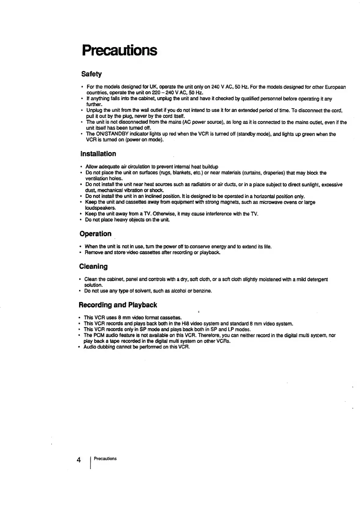 Sony EV-C500E - Precautions; Safety Precautions; Installation Guidelines; Operation and Cleaning Instructions