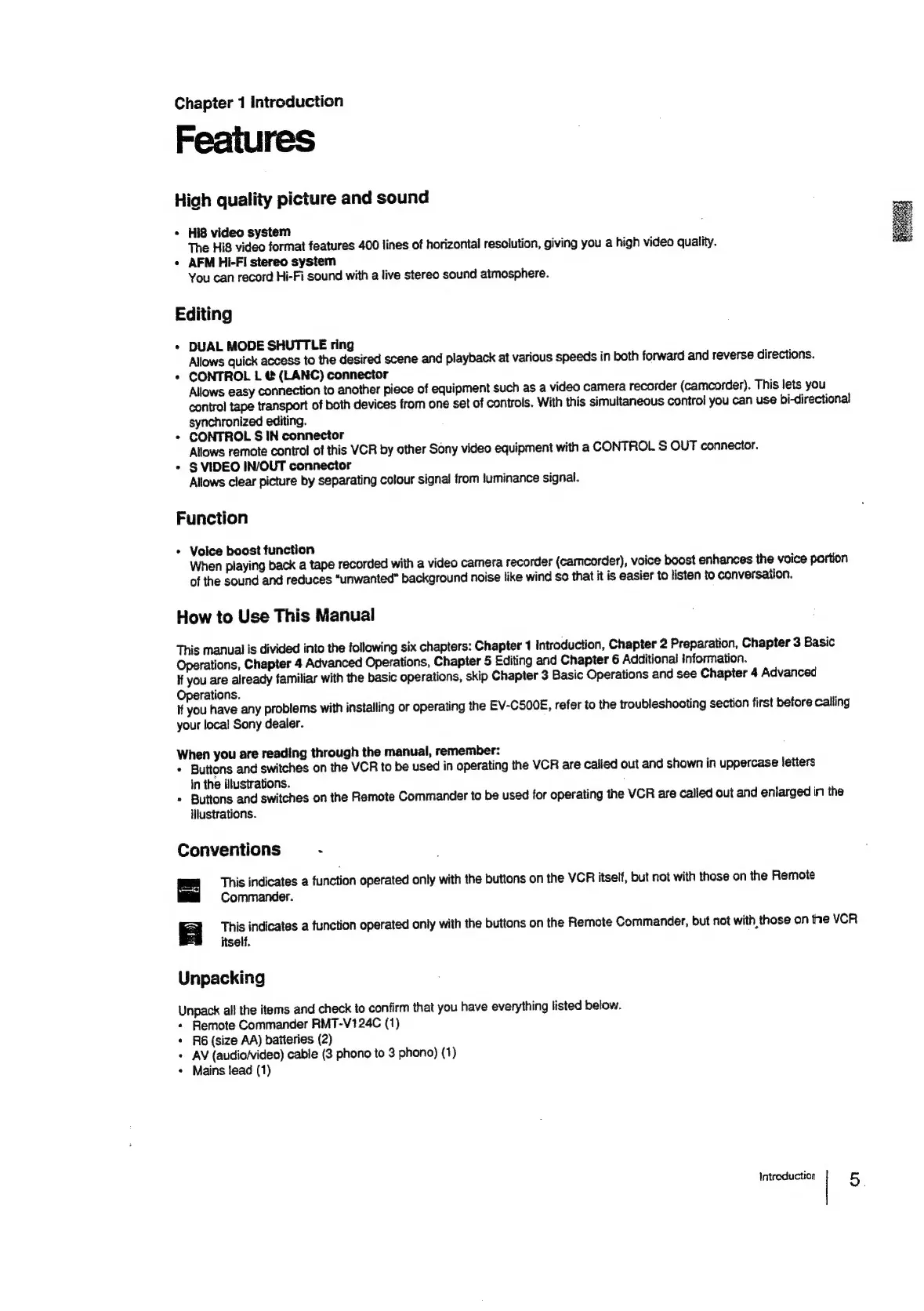 Sony EV-C500E - Chapter 1 Introduction; VCR Features Overview; How to Use This Manual; Unpacking the VCR