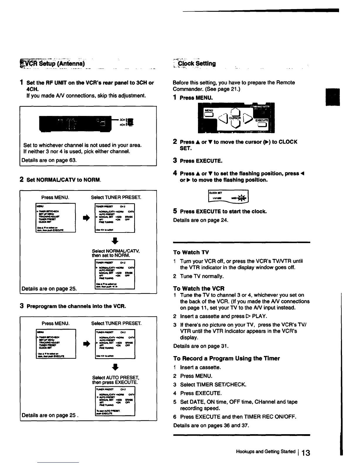 Sony EV-S2000 - Antenna Hookup Setup; VCR Setup and Clock Setting; Viewing and Recording Procedures