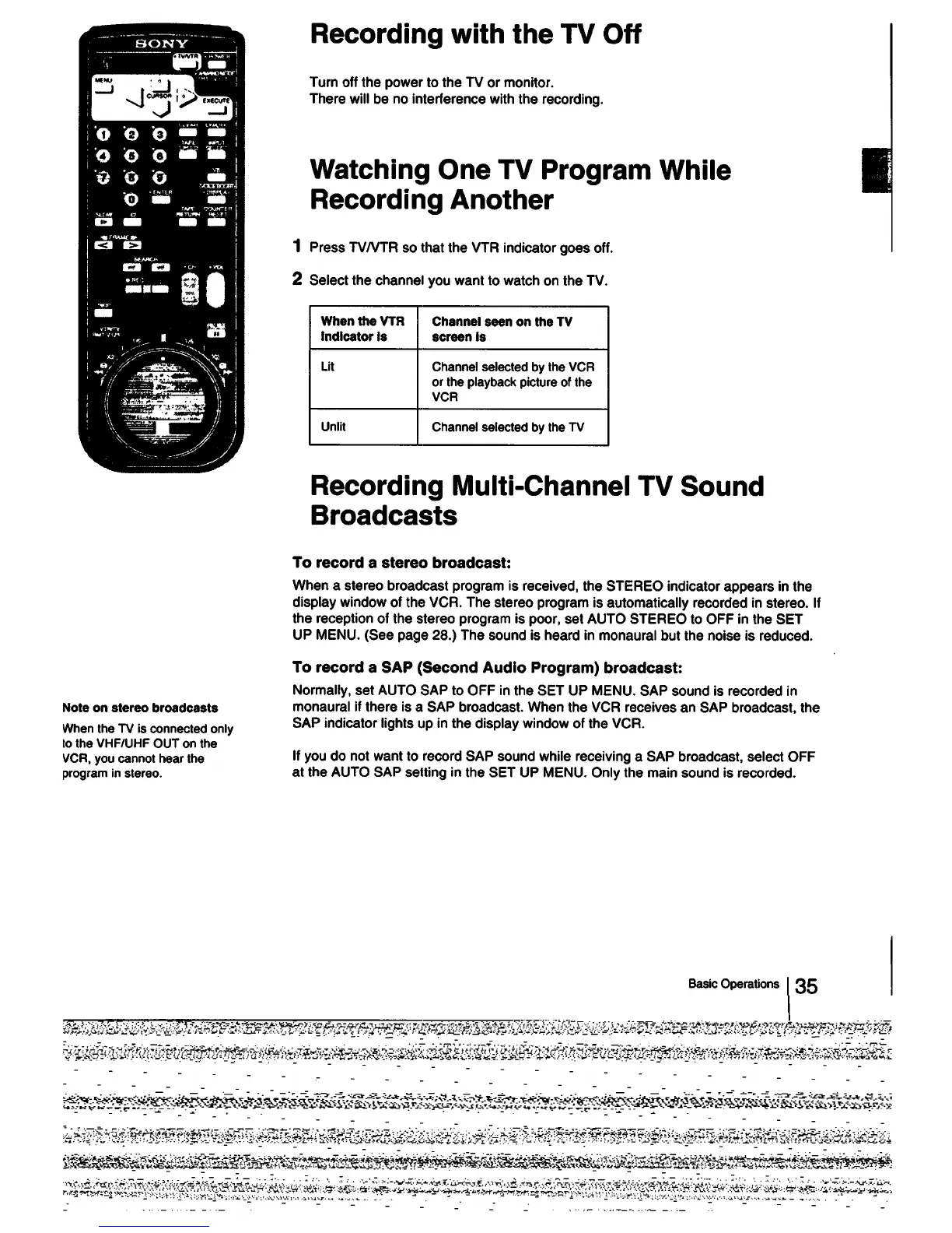 Sony EV-S2000 - Special Recording Scenarios; Recording with TV Off and Watching Simultaneously; Recording Multi-Channel Sound; Stereo and SAP Broadcast Recording