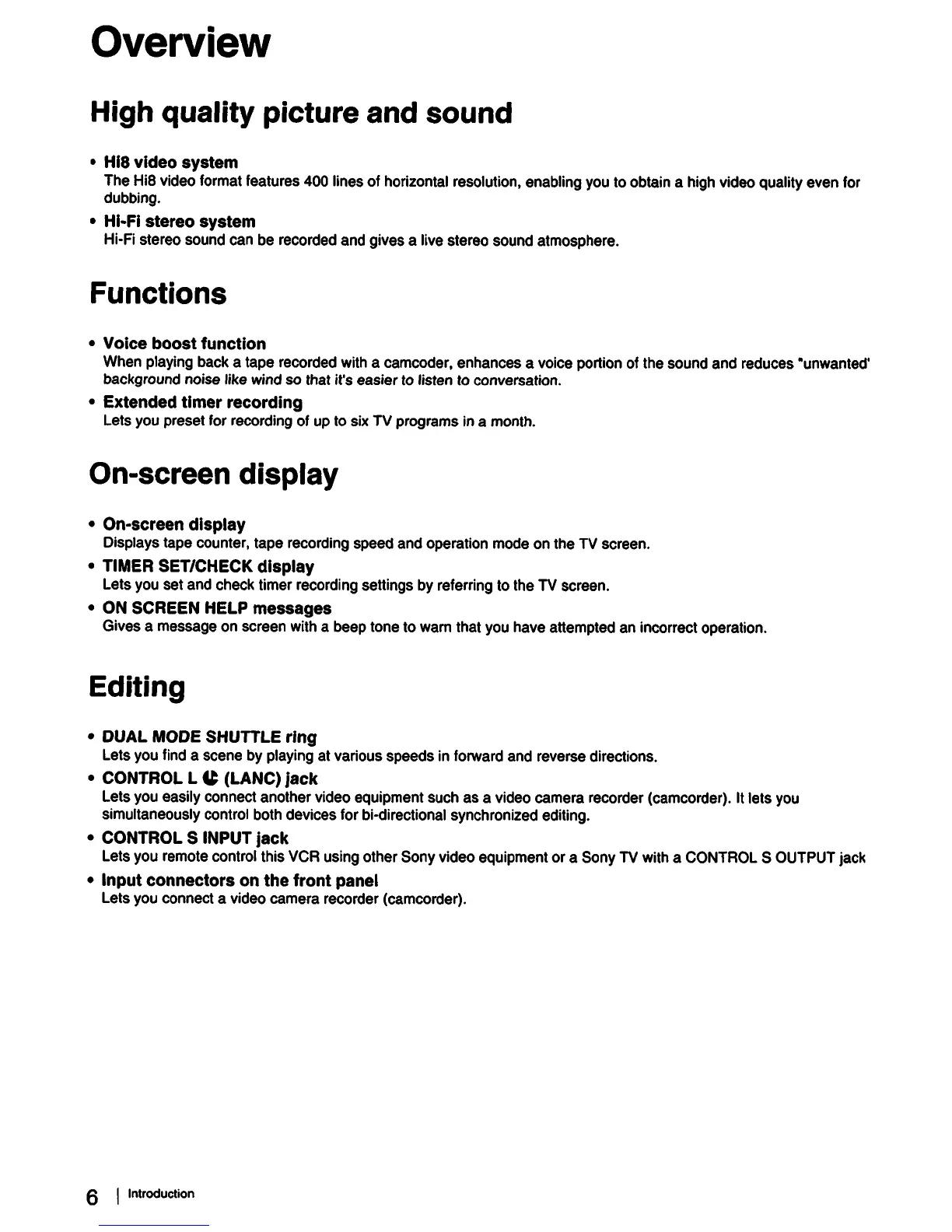 Sony EV-S2000 - Overview of VCR Features; High Quality Picture and Sound; Key VCR Functions and Capabilities; On-Screen Display and Editing Features
