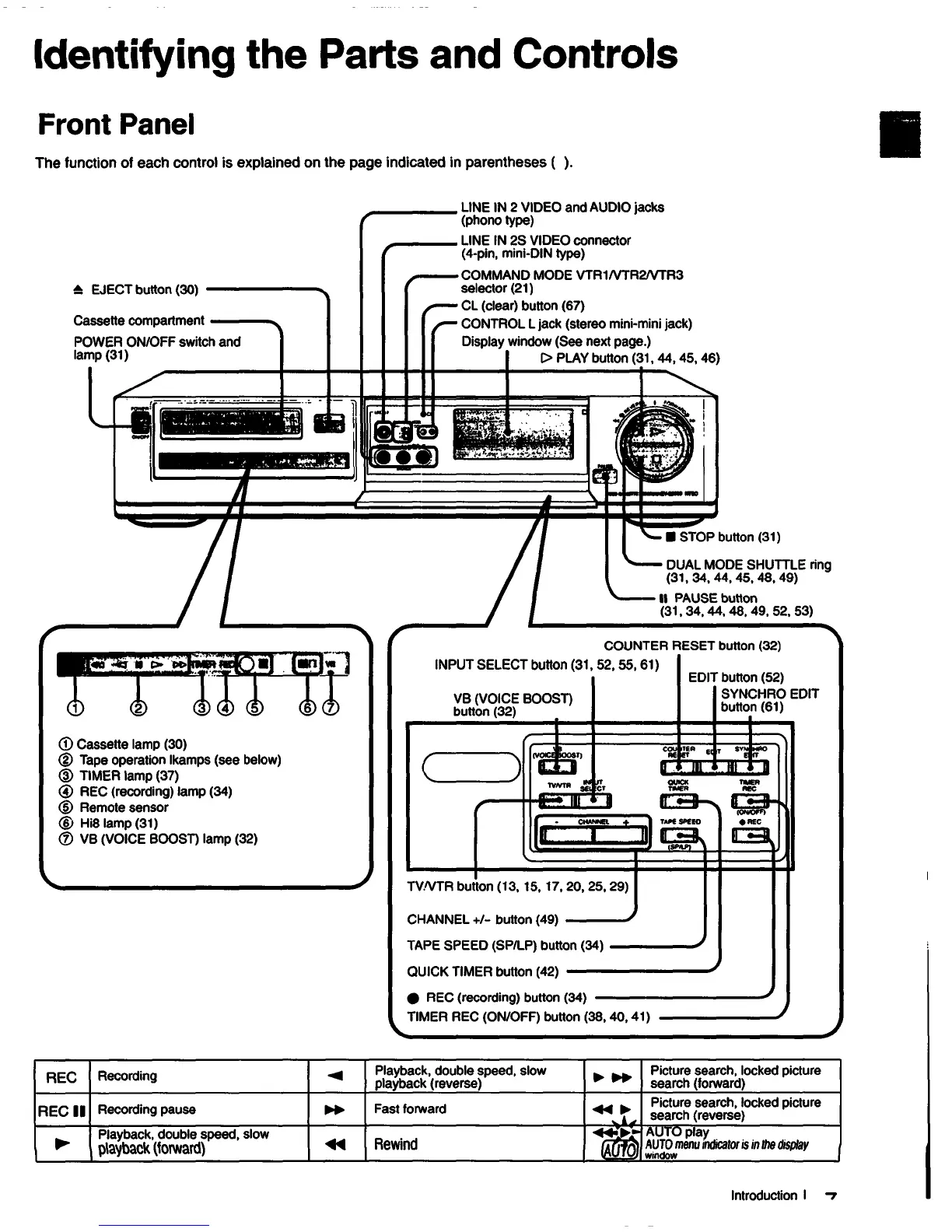 Sony EV-S2000 - Identifying VCR Components; Front Panel Controls and Indicators