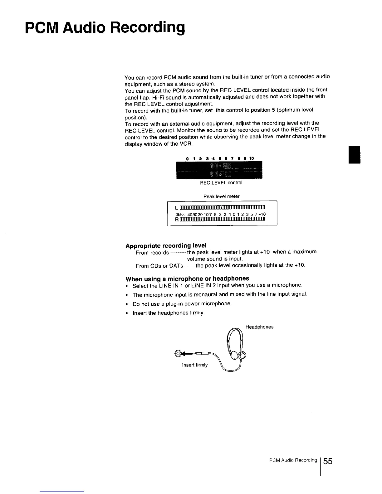 Sony EV-S3000 - PCM Audio Recording; Appropriate Recording Level; When Using a Microphone or Headphones