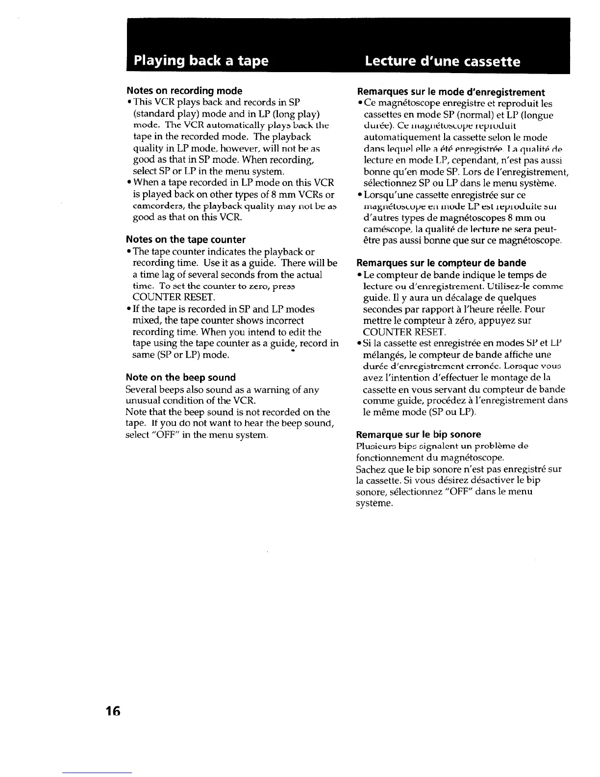 Sony EVO-250 - Playback Notes; Notes on Recording Mode