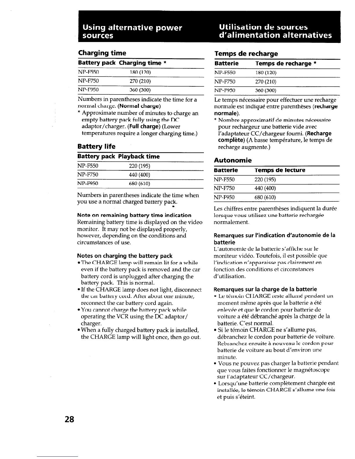 Sony EVO-250 - Charging Time; Battery Life