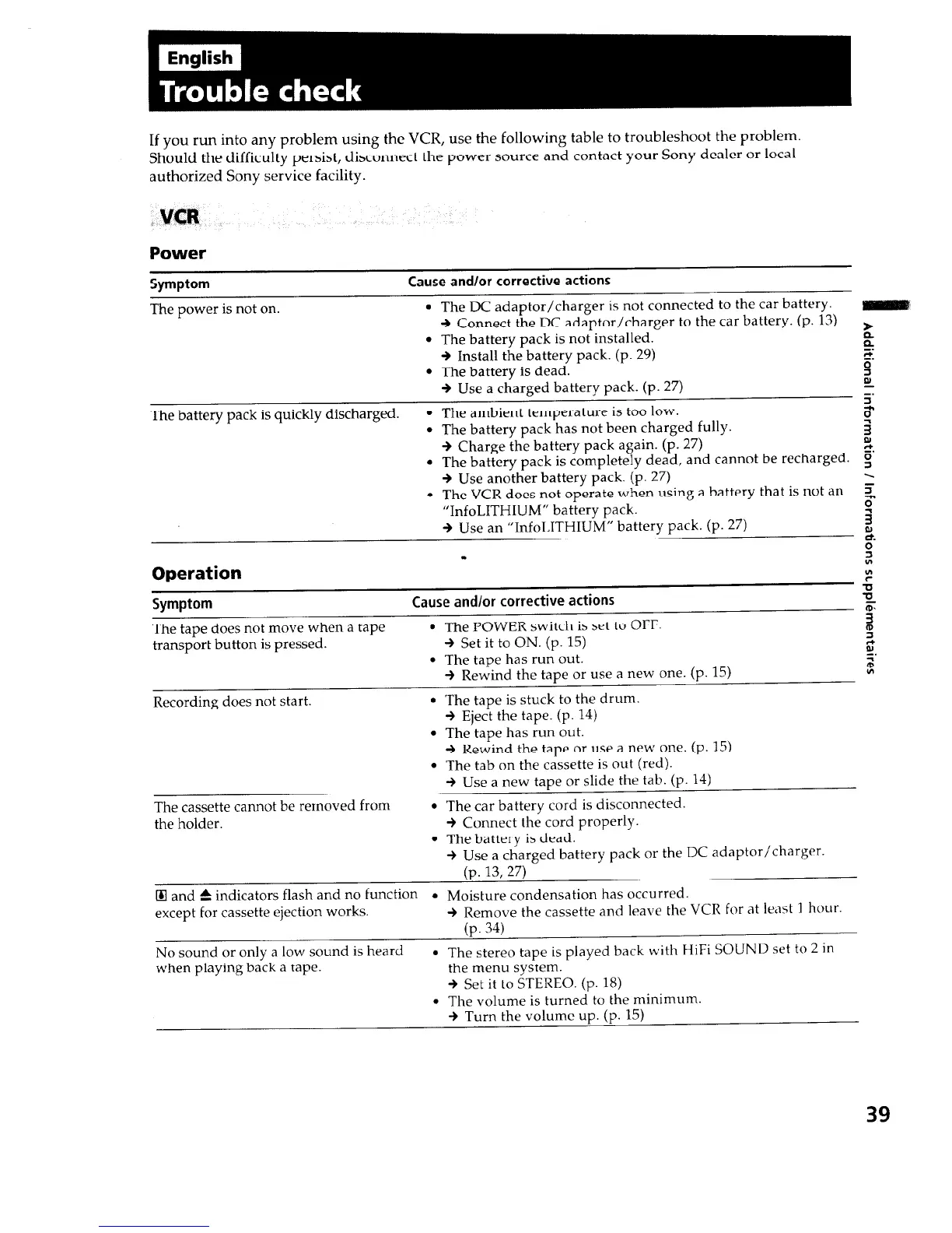 Sony EVO-250 - Trouble Check; Power Related Issues