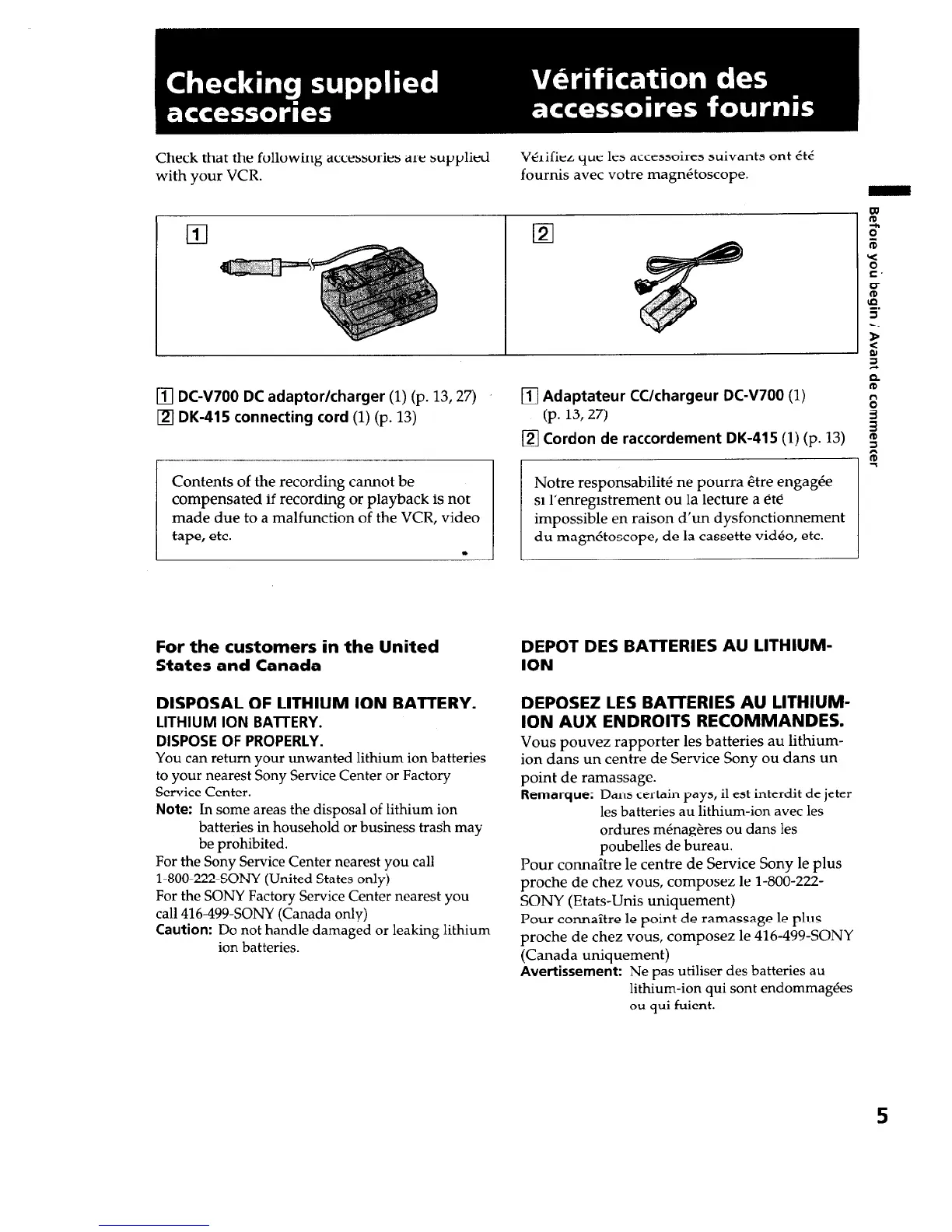 Sony EVO-250 - Checking Supplied Accessories; Disposal of Lithium Ion Battery