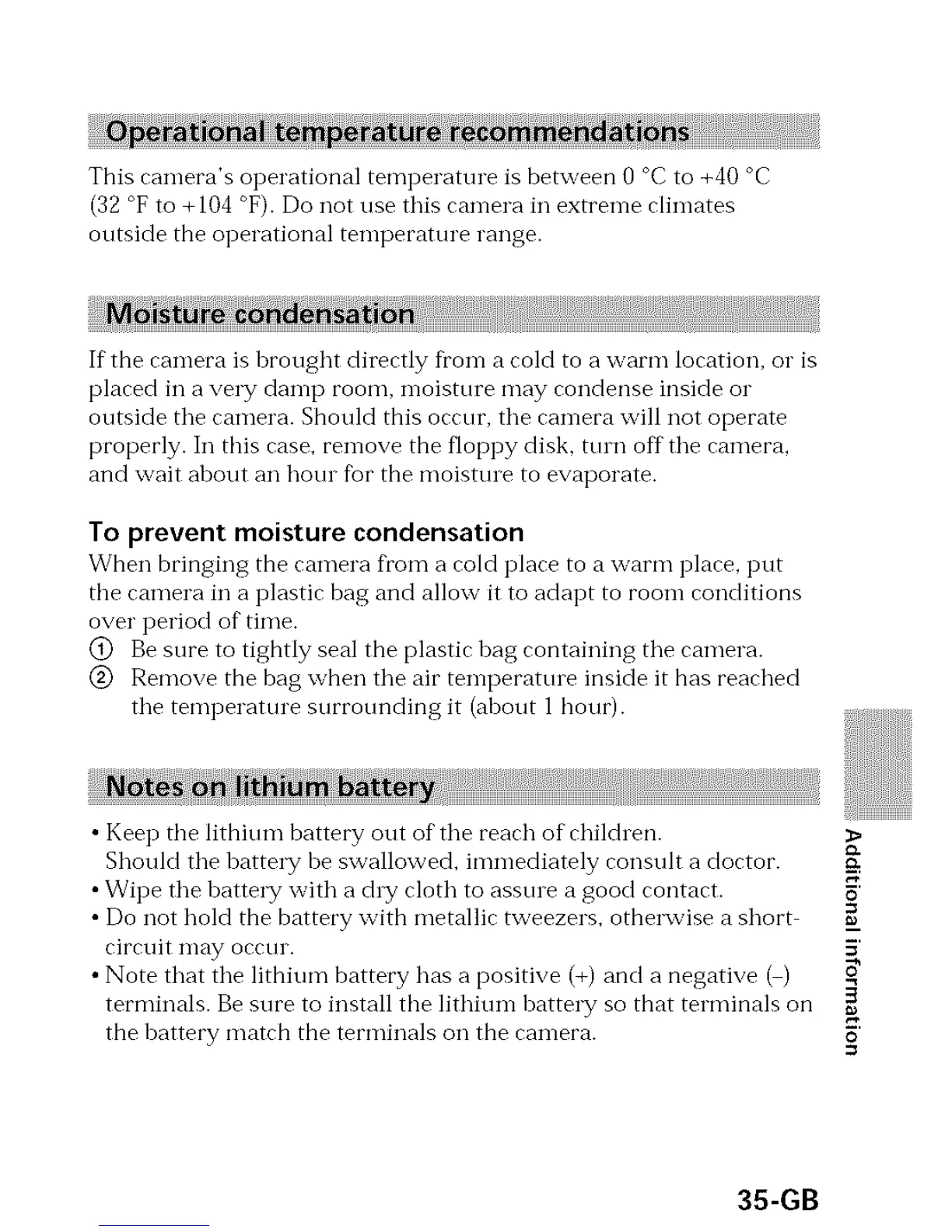 (32 °F to +104 °F). Do not use this camera ill exFeme climates