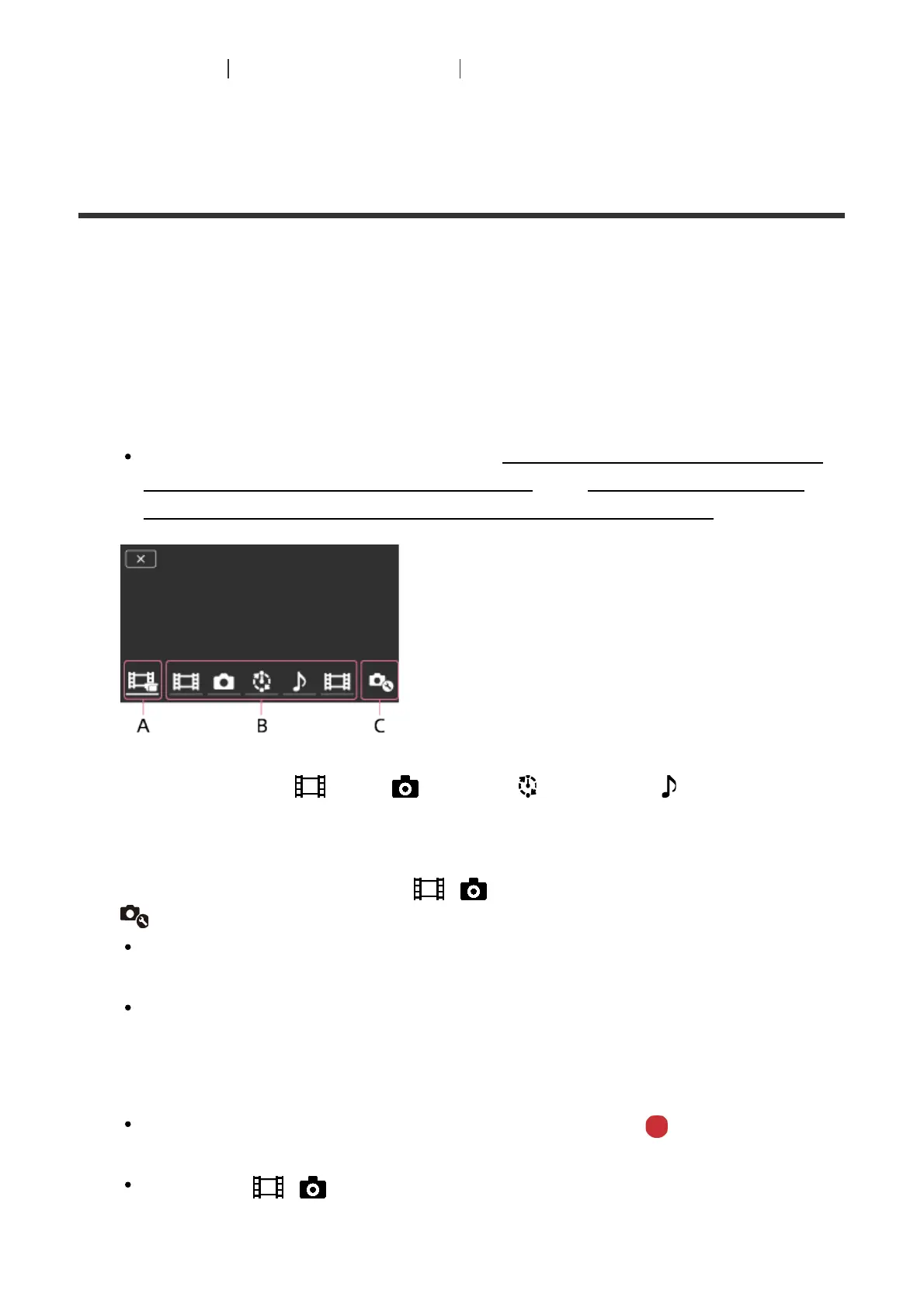 B: Shooting modes ( Movie, Still Image, Interval Shoot, Audio) of connected