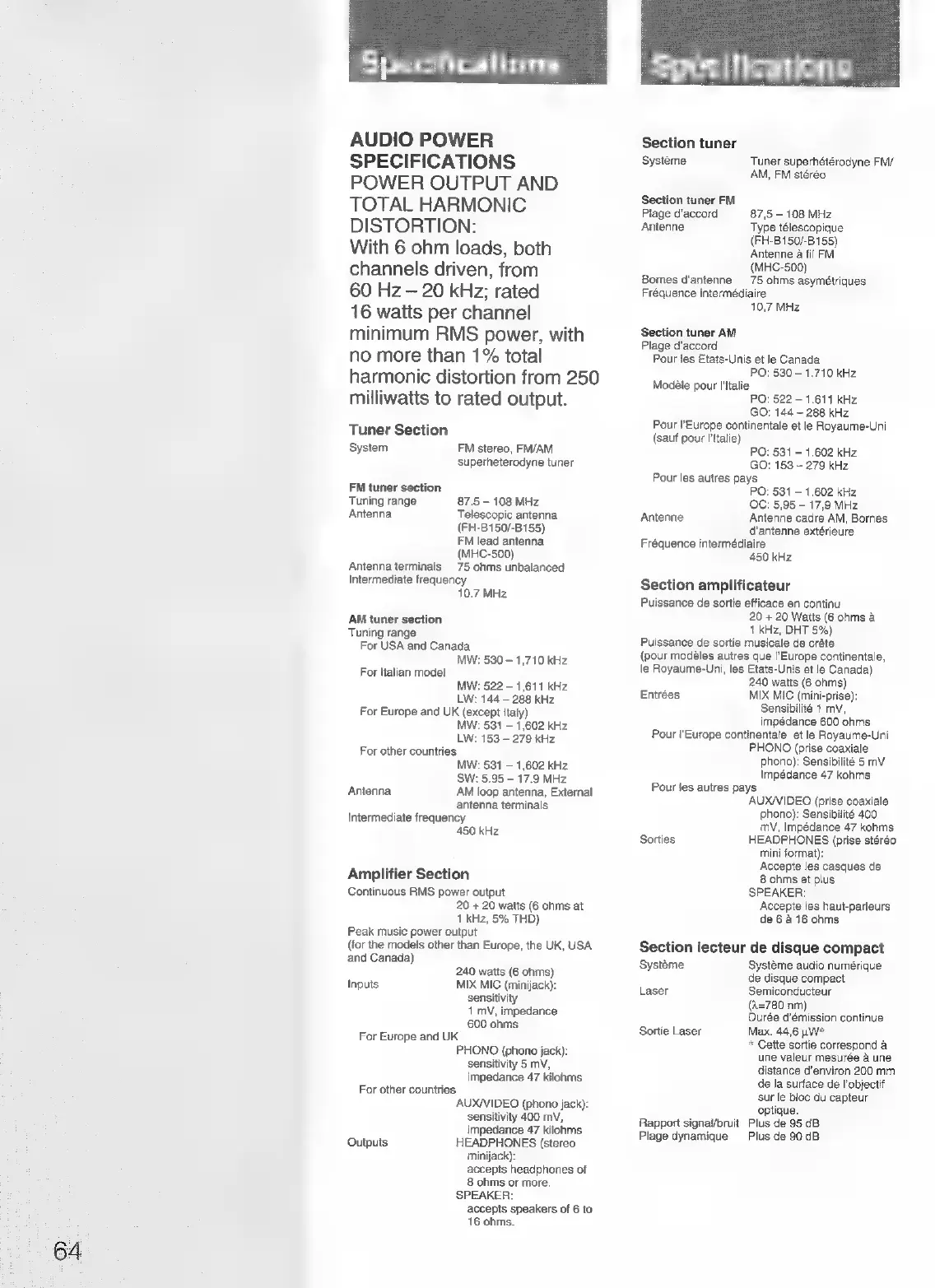 Sony FH-B150 - Specifications; AUDIO POWER SPECIFICATIONS; Tuner Section; AM tuner section