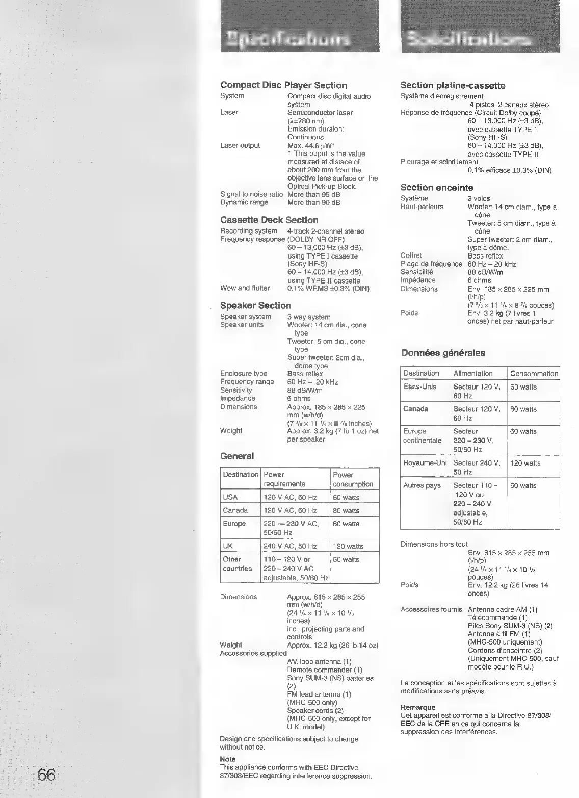 Sony FH-B150 - Specifications; Compact Disc Player Section; Cassette Deck Section; Speaker Section