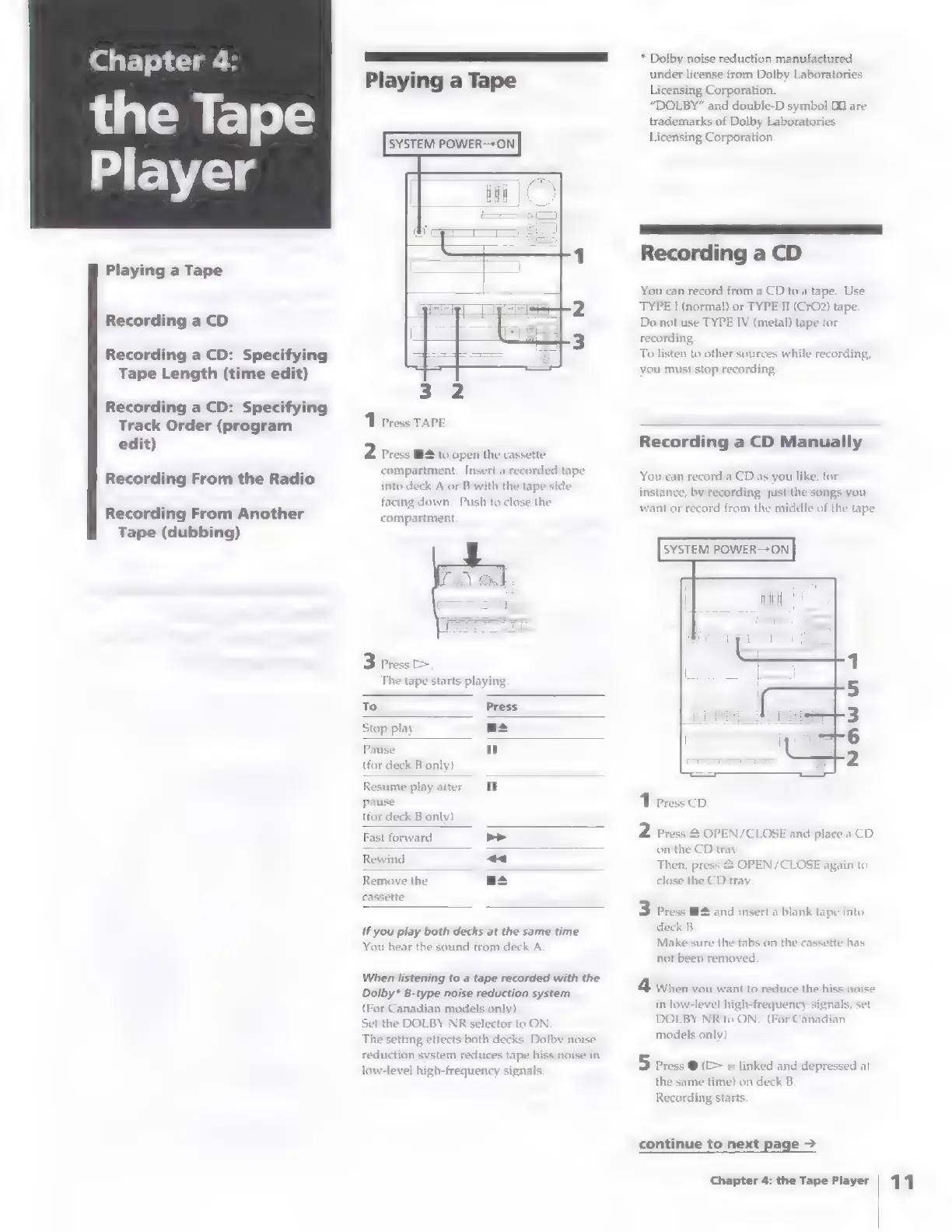 Sony FH-B411 - Tape Player Operations; Playing a Tape; Recording a CD to Tape
