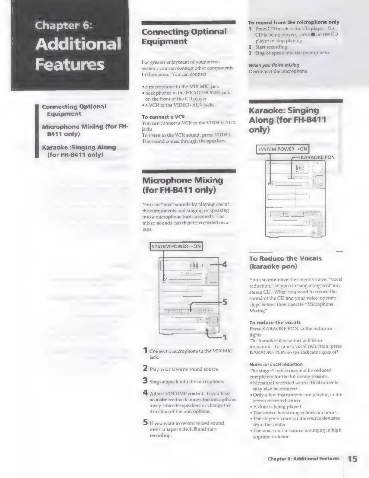 Sony FH-B411 - Chapter 6: Additional Features; Connecting Optional Equipment; Microphone Mixing (for FH-B411 Only); Karaoke: Singing Along (for FH-B411 Only)