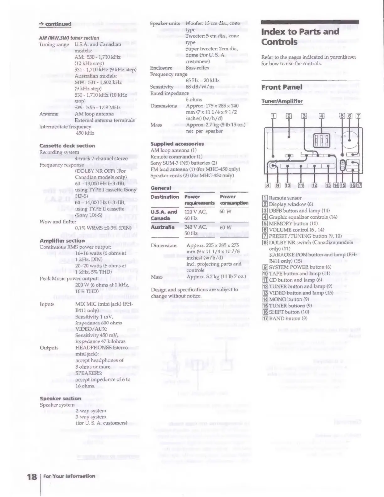 Sony FH-B411 - Index to Parts and Controls