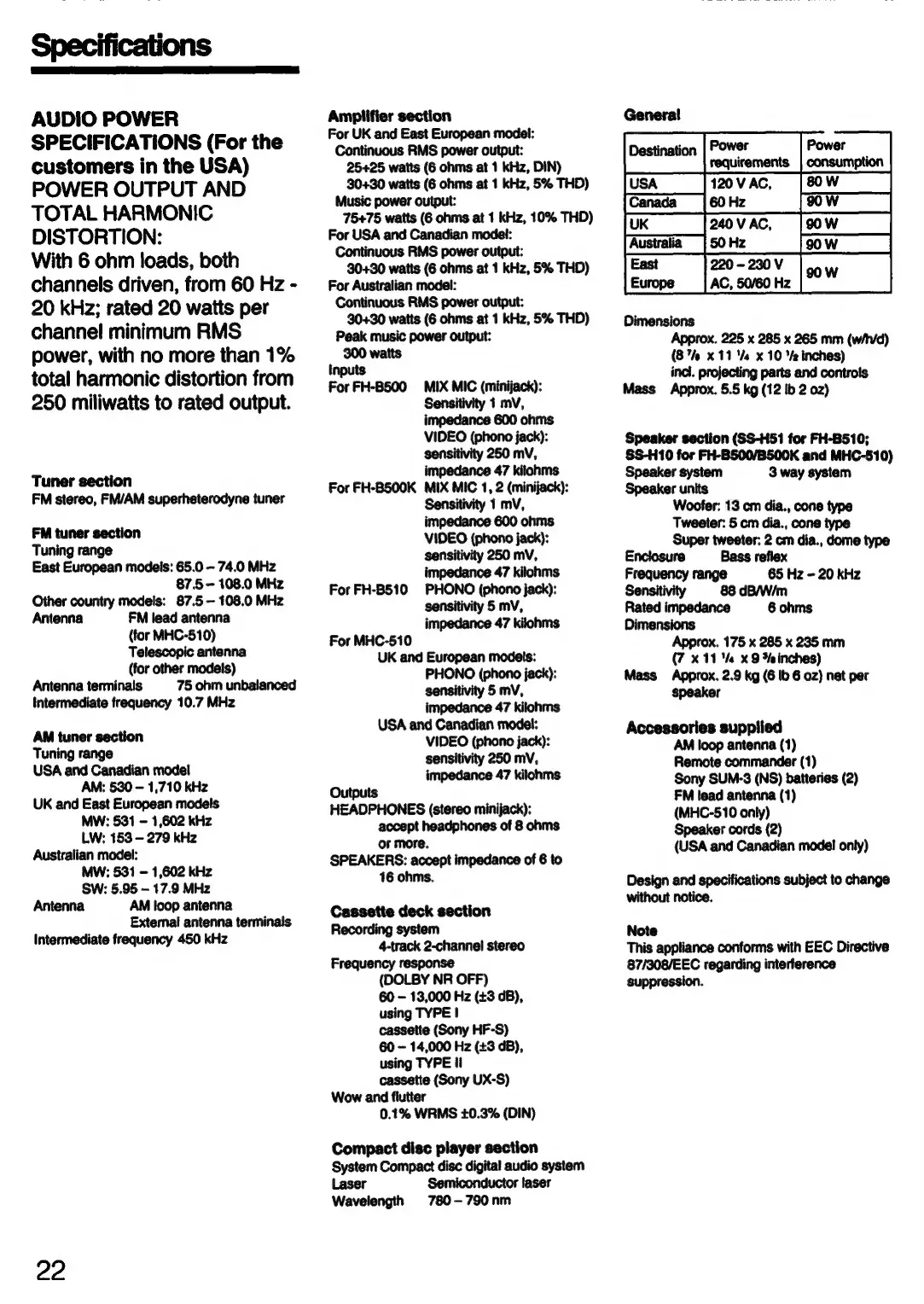 Sony FH-B500 - Specifications
