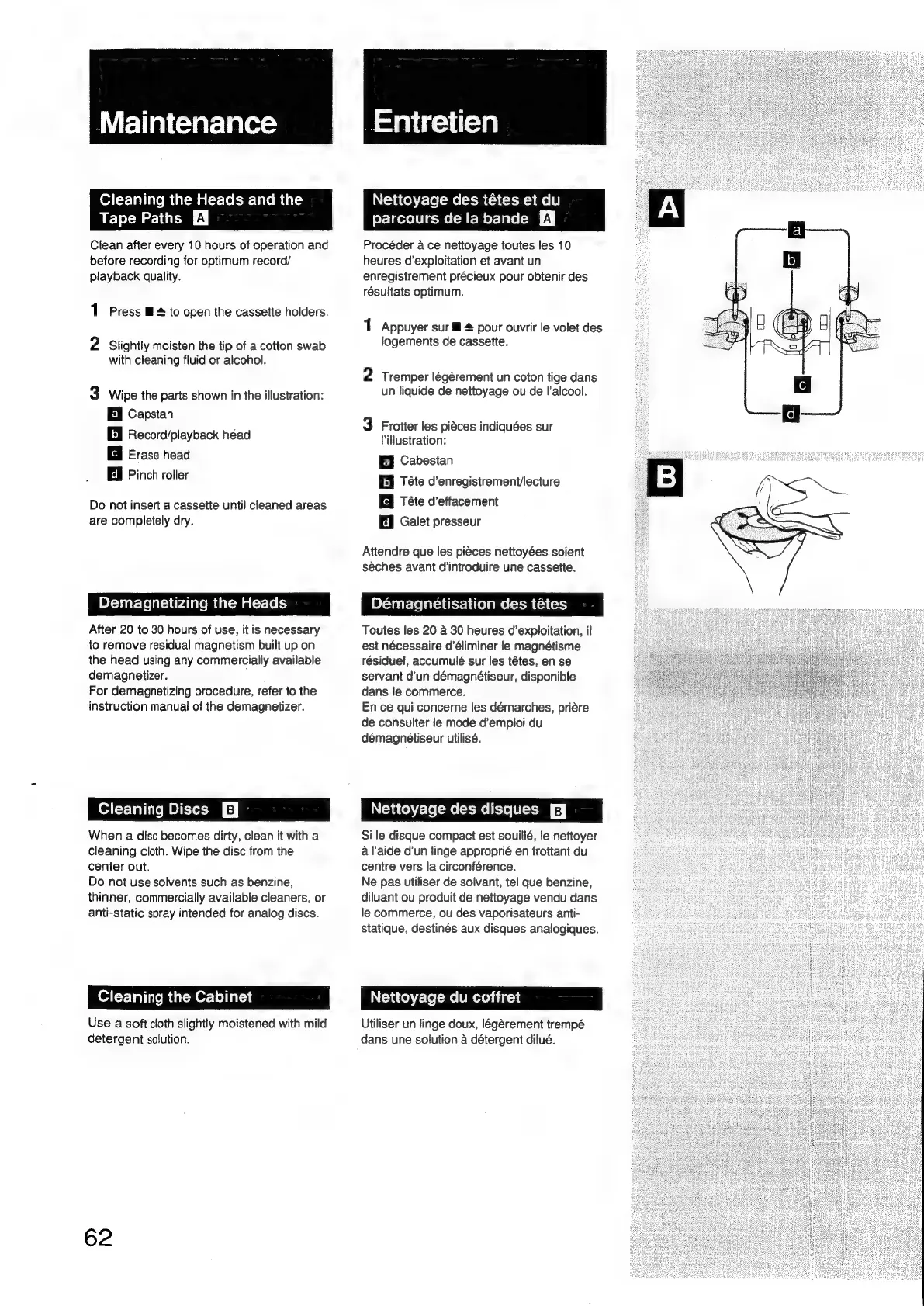 Sony FH-B50CD - Maintenance and Cleaning; Cleaning Tape Heads and Paths; Demagnetizing Heads and Disc Cleaning; Cabinet Cleaning