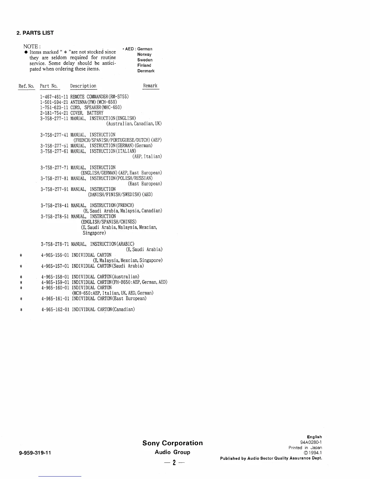 Sony FH-B650 - Parts List; Parts Identification; Notes on Stocked Items