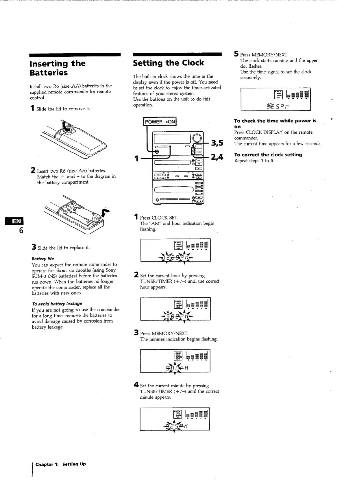 Sony FH-C33X - Inserting the Batteries; Setting the Clock