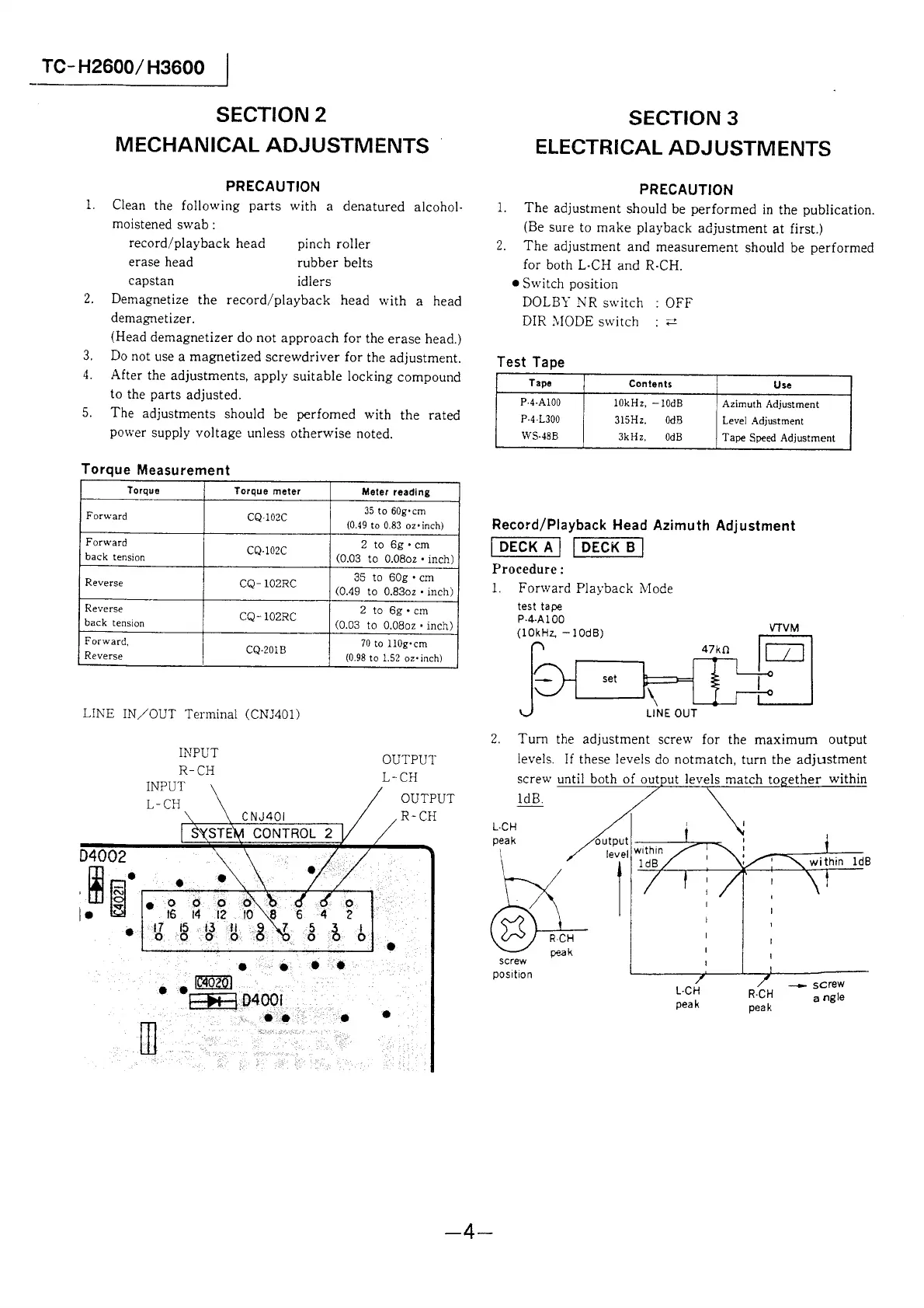 Sony FH-E737CD - Mechanical Adjustments; Electrical Adjustments; Torque Measurement; Record;Playback Head Azimuth Adjustment