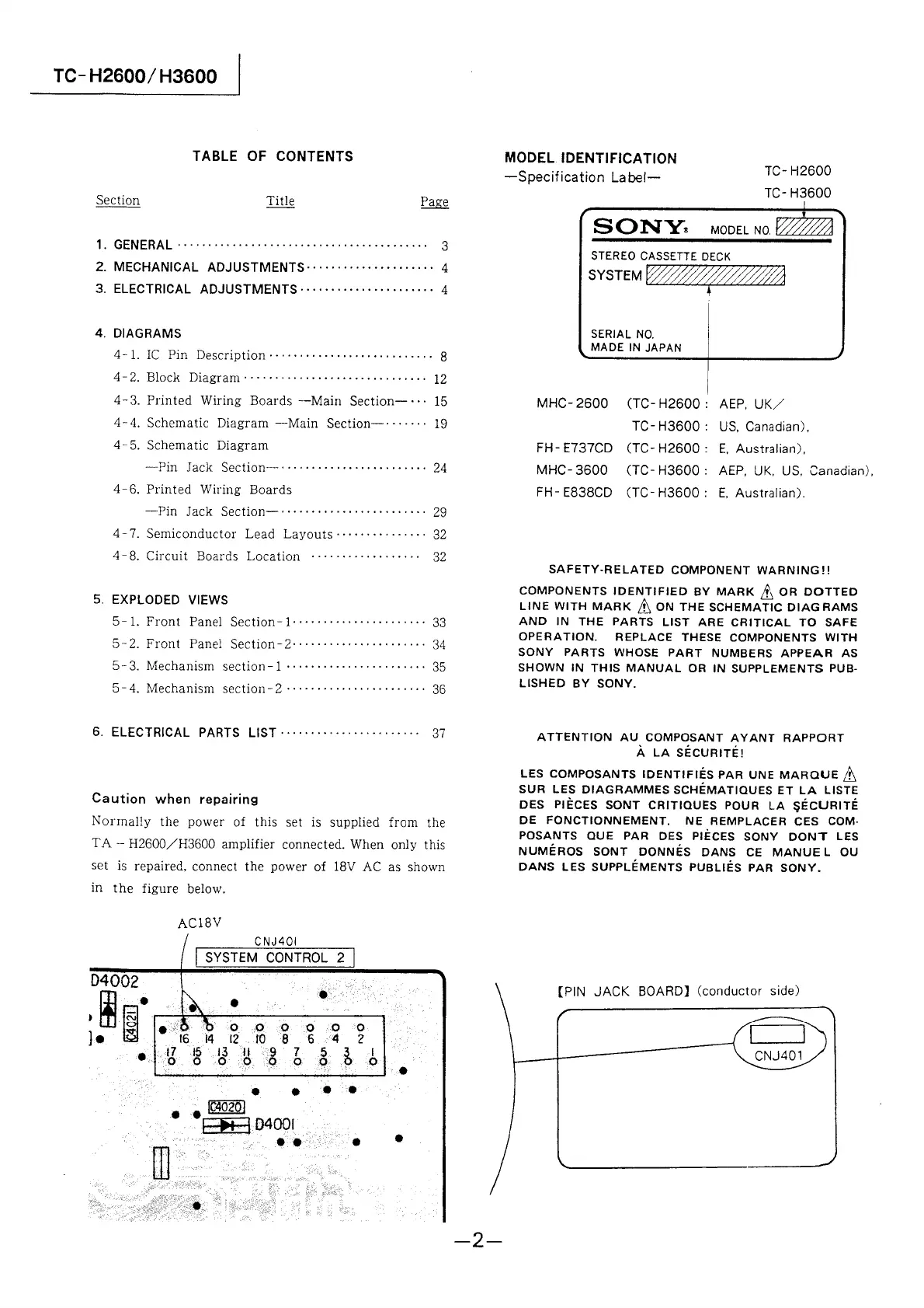 Sony FH-E838CD - Table of Contents; Model Identification; Caution When Repairing