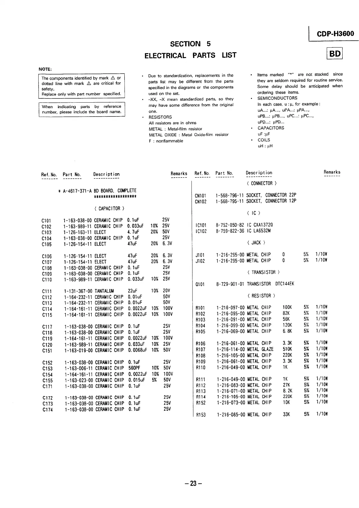 Sony FH-E838CD - CDP-H3600 - Electrical Parts List