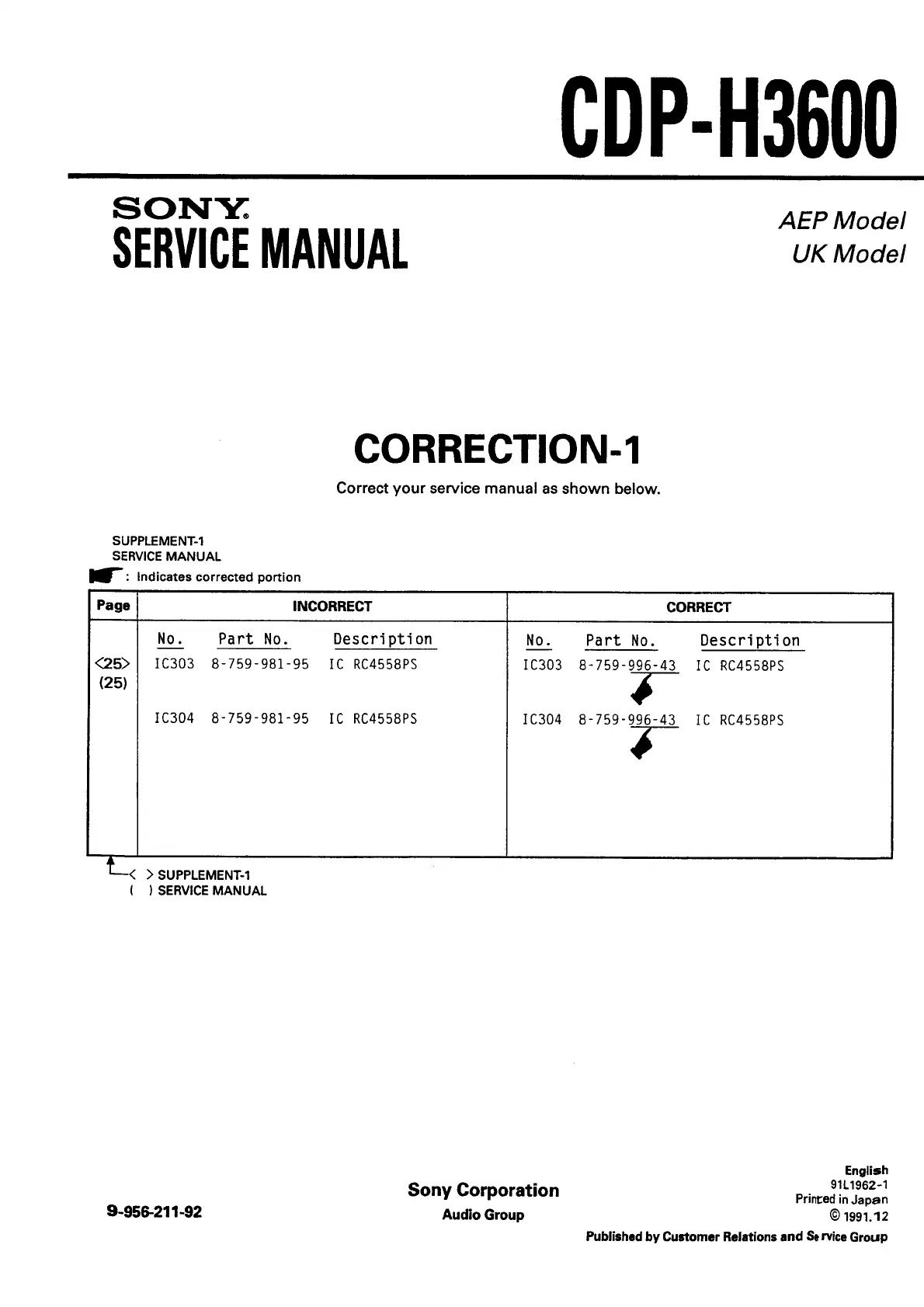 Sony FH-E838CD - CDP-H3600 - Correction