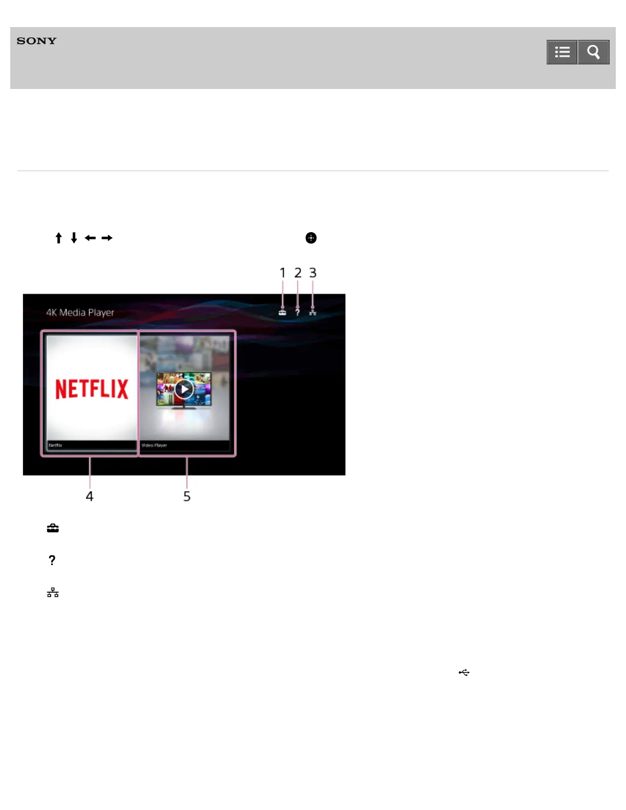 The Home menu is the gateway for playing various kinds of content. You can also check the status of the 4K Media