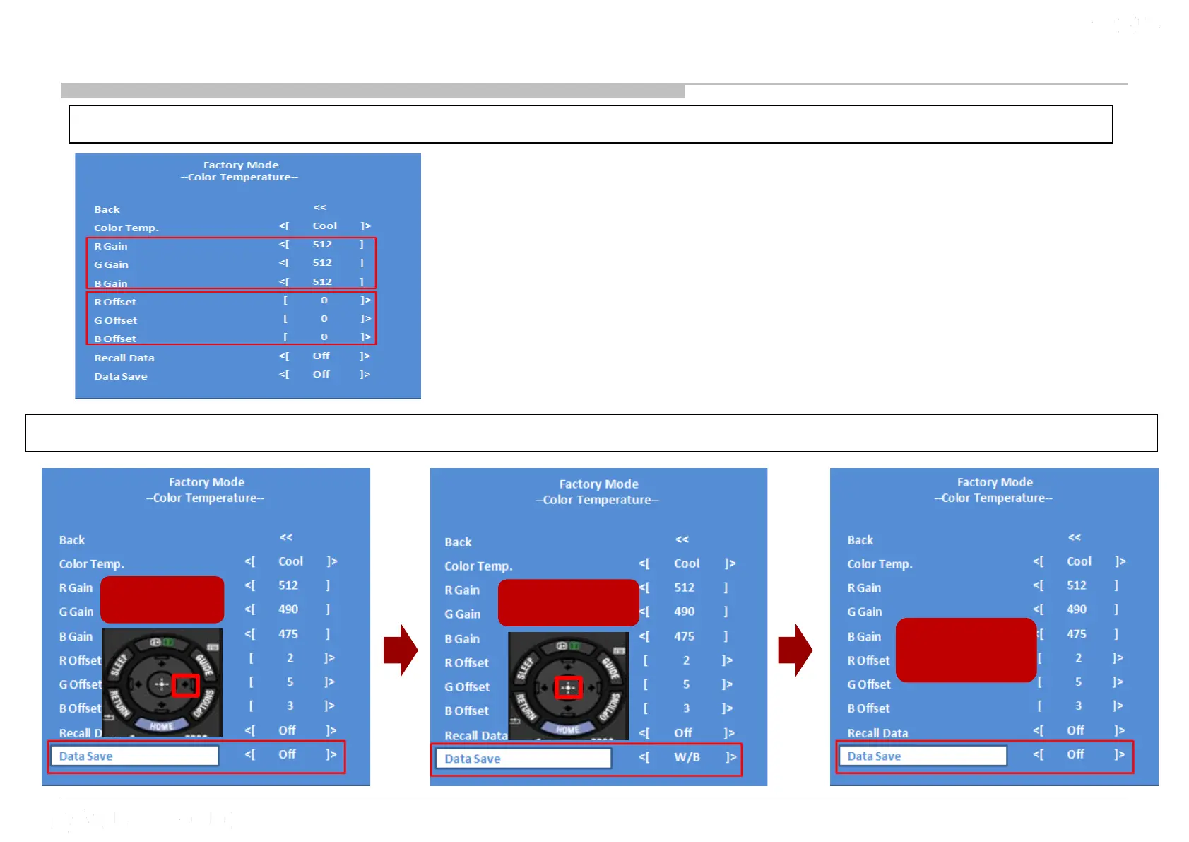 4) After adjustment completed go to “Data Save” and press until it shows “W/B” and press “Enter”.