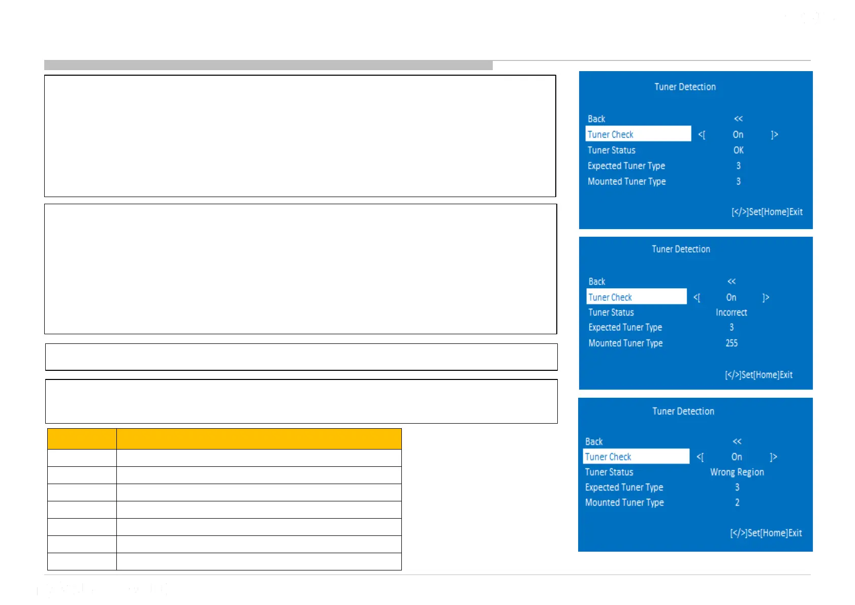 • “Tuner Status” = Incorrect. Tuner module is not inserted correctly.