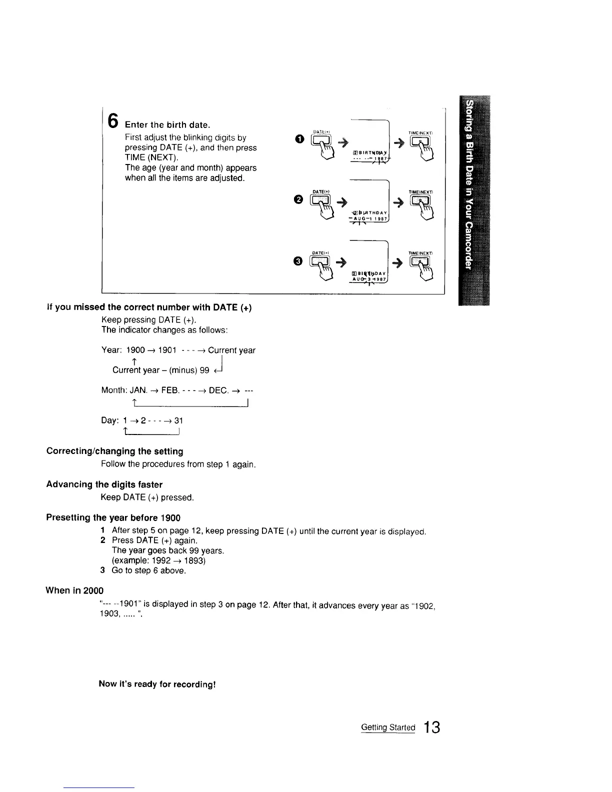 "-.... 1901" is displayed in step 3 on page 12. After that, it advances every year as "1902,