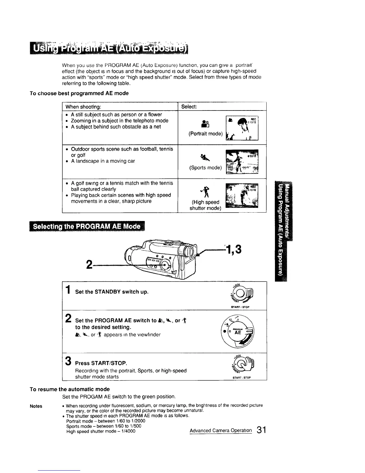 Set the PROGRAM AE switch to _, _, or _'