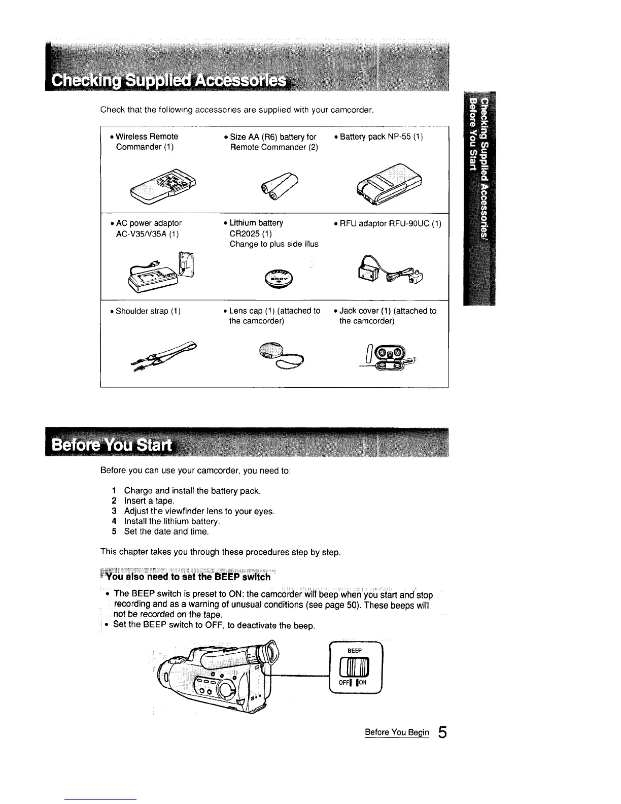 • The BEEP switch is preset to ON: the camcorder will beep when you start and'stop