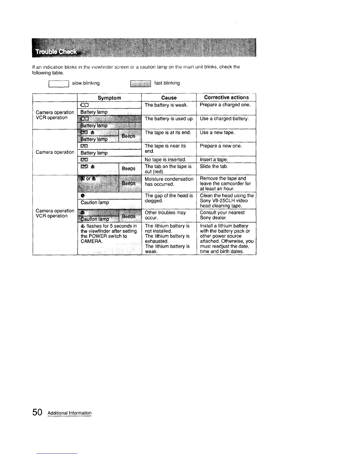 If an indication blinks in the viewfinder screen or a caution lamp on the main unit blinks, check the