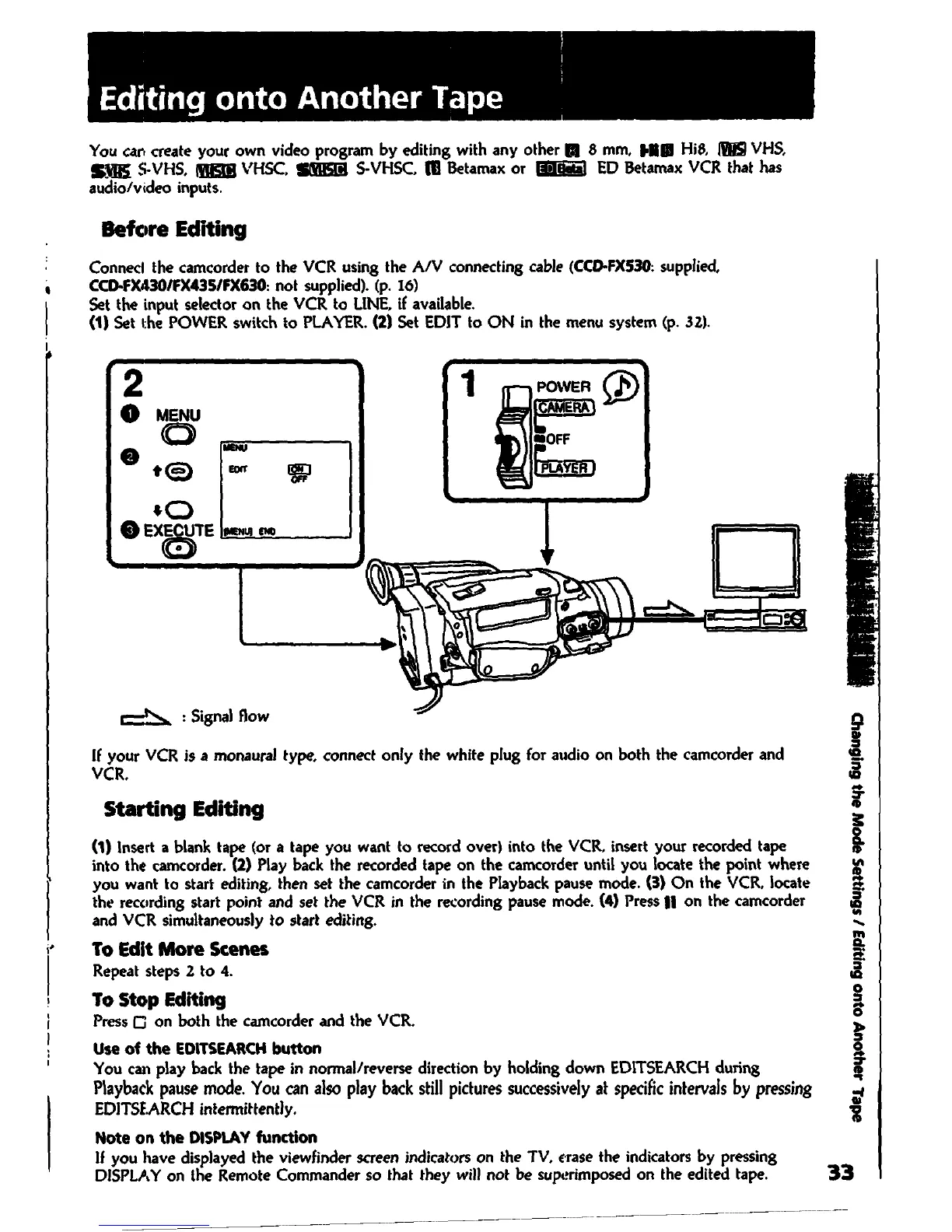 Sony Handycam CCD-FX430 - Editing Onto Another Tape; Before Editing; Starting Editing; To Stop Editing